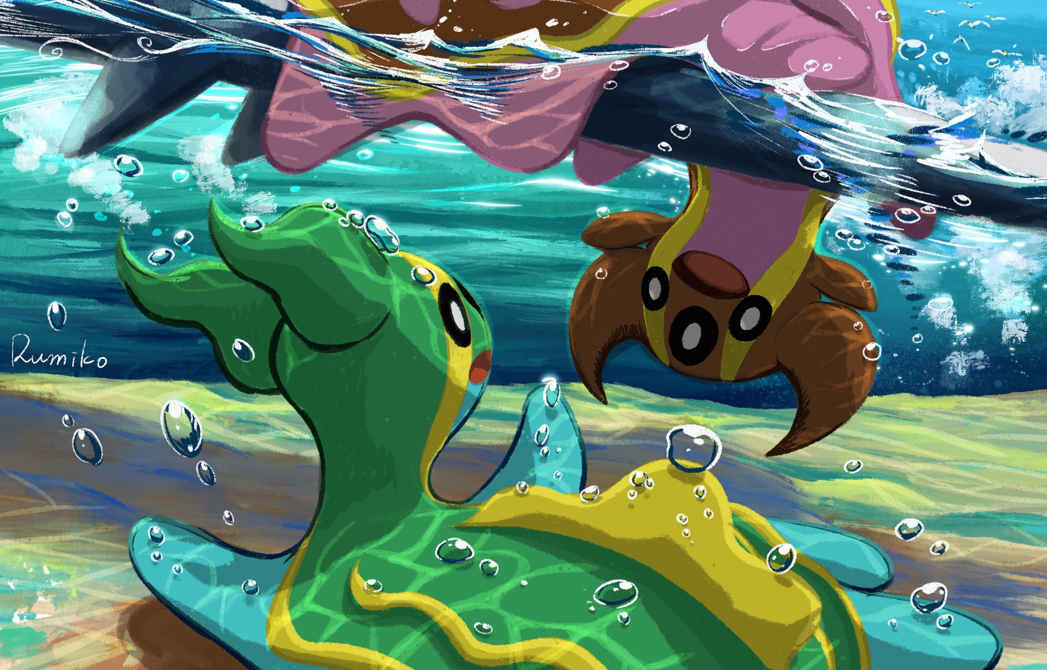 :o air_bubble artist_name blue_skin bubble colored_skin gastrodon gastrodon_(east) gastrodon_(west) gen_3_pokemon gen_4_pokemon green_skin highres looking_at_another multicolored_skin nintendo no_humans nudibranch open_mouth partially_submerged pink_skin pokemon pokemon_(creature) pokemon_focus rumiko_(vertlapin96) sea_slug signature slug third_eye underwater wingull