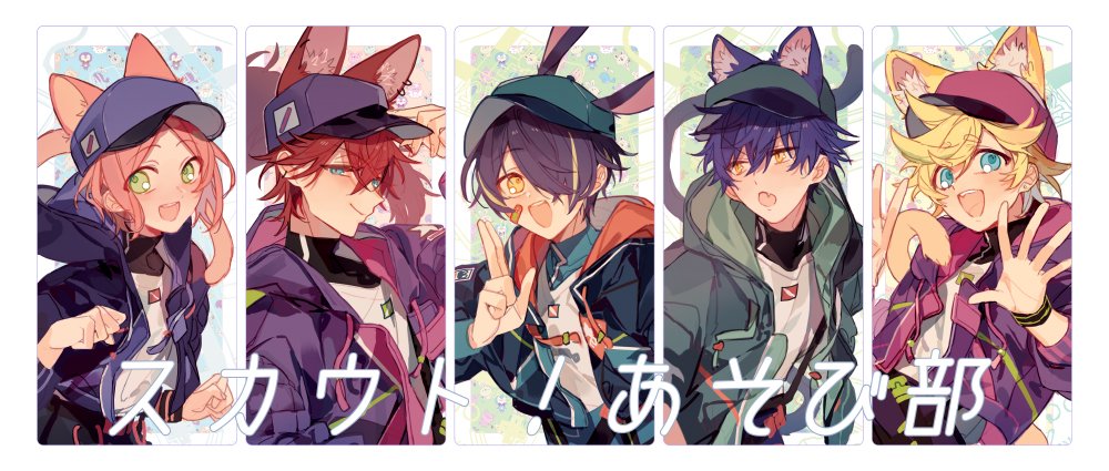 5boys amagi_rinne animal_ears aoi_yuta baseball_cap blonde_hair blue_eyes blue_hair blue_hat blue_jacket cat_ears cat_tail closed_mouth ensemble_stars! fox_ears fox_tail green_eyes green_hat green_jacket hair_over_one_eye hand_up harukawa_sora hat jacket looking_at_viewer multicolored_hair multiple_boys open_mouth pink_hair pink_hat purple_hat purple_jacket rabbit_ears red_hair salute sapphire_(nine) sazanami_jun sengoku_shinobu smile streaked_hair tail two-finger_salute v yellow_eyes