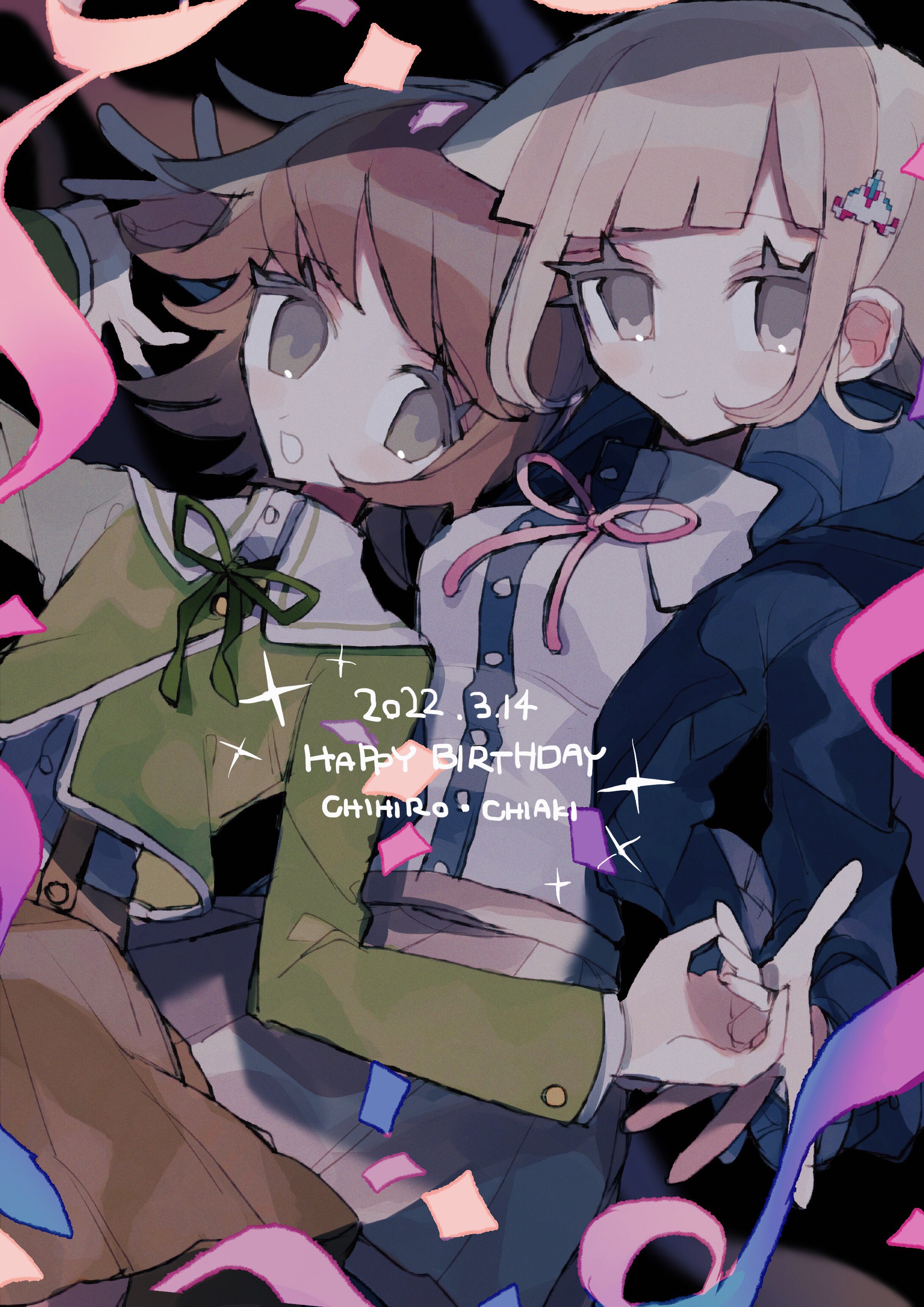 1boy 1girl absurdres birthday_connection black_background blue_jacket blue_skirt blue_sleeves breasts brown_hair brown_skirt buttons character_name closed_mouth collared_shirt commentary_request confetti cowboy_shot crossdressing crossdressing_(mtf) danganronpa:_trigger_happy_havoc danganronpa_(series) danganronpa_2:_goodbye_despair dated english_text eyelashes fujisaki_chihiro green_eyes green_jacket green_ribbon green_sleeves hair_ornament hairclip happy_birthday high_collar highres hood hood_down hooded_jacket interlocked_fingers jacket layered_sleeves light_brown_hair long_sleeves looking_at_viewer manaita_no_sake medium_breasts midriff nanami_chiaki neck_ribbon open_clothes open_jacket open_mouth pink_eyes pink_hair pink_ribbon ribbon shirt short_hair simple_background skirt smile sparkle suspenders trap white_shirt