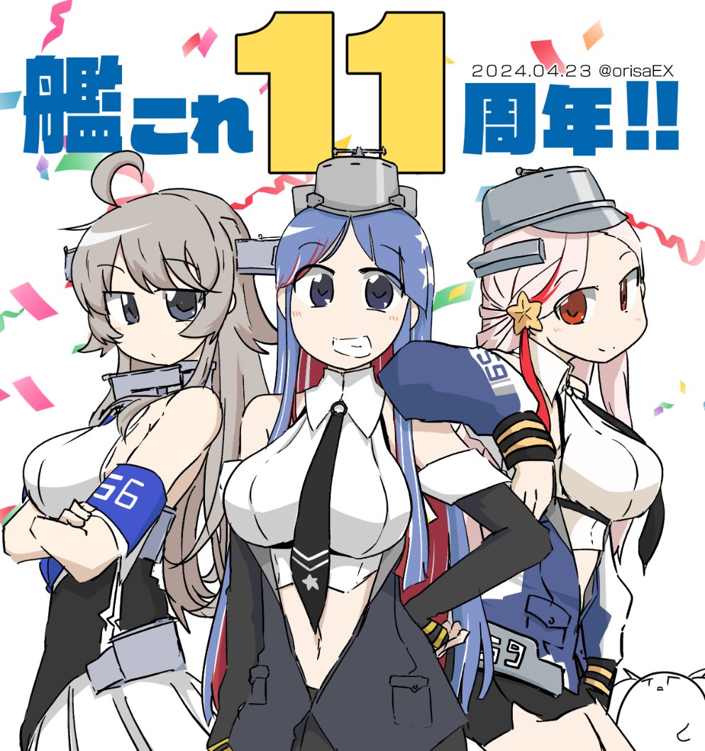 3girls ahoge anniversary blonde_hair blue_hair breasts grey_eyes grey_hair grin headgear kantai_collection large_breasts long_hair massachusetts_(kancolle) multicolored_hair multiple_girls red_eyes red_hair shiki_kyouzoku shirt skirt sleeveless sleeveless_shirt smile south_dakota_(kancolle) star_(symbol) streaked_hair washington_(kancolle) white_hair white_skirt