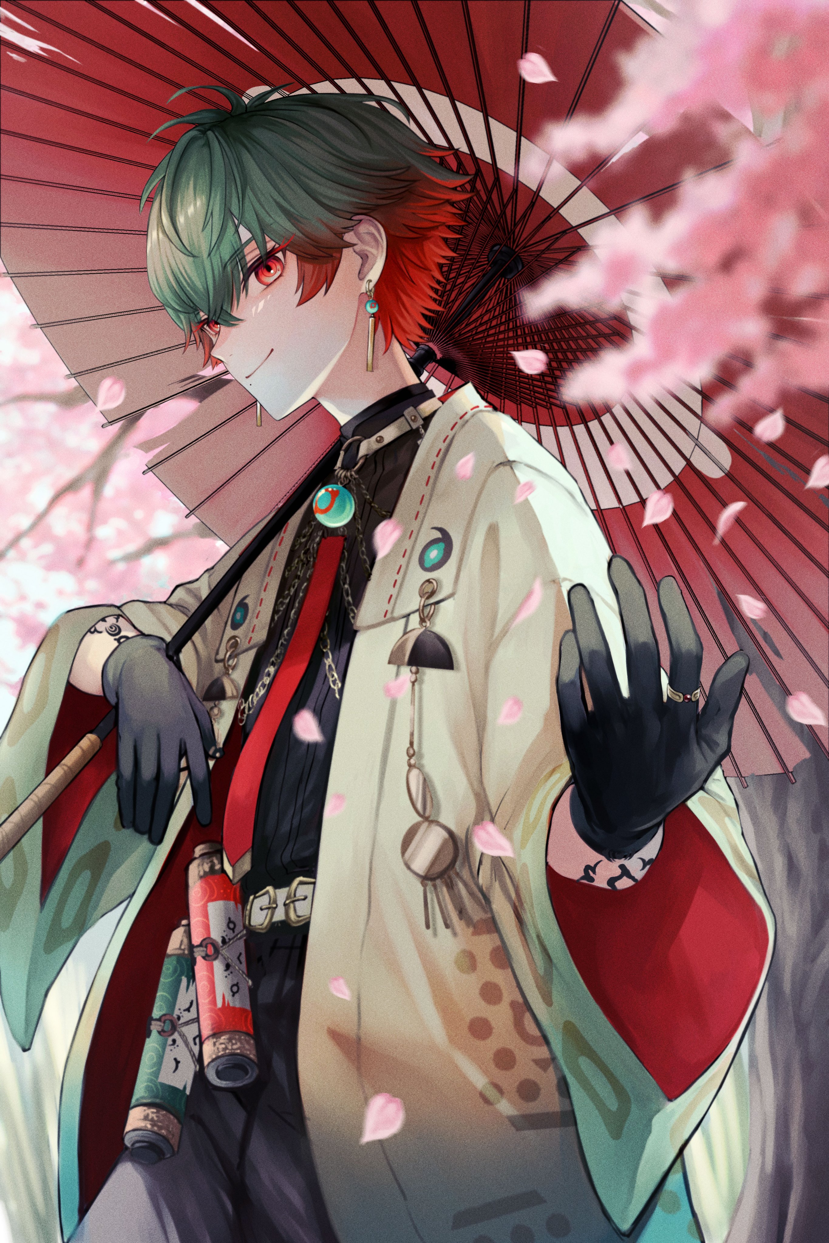 1boy absurdres animal_ears belt black_gloves black_pants cherry_blossoms choker commentary earrings floating_earrings flower fox_ears fox_tail from_side gloves green_hair hair_between_eyes highres holding holding_umbrella jewelry male_focus multicolored_hair neo-porte oil-paper_umbrella outdoors pants pink_flower red_eyes red_hair scroll short_hair smile solo untranslatable_commentary tail tree two-tone_hair umbrella upper_body virtual_youtuber white_belt xxx_akc yagami_tsukumo