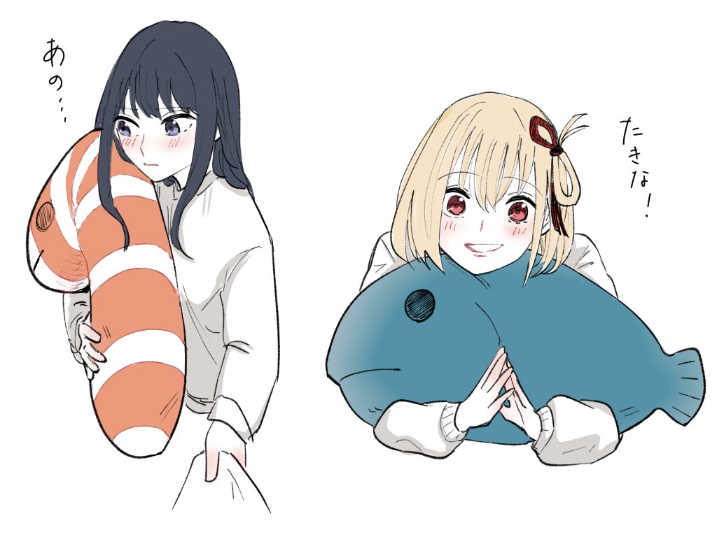 2girls black_hair blonde_hair blush closed_mouth clothes_grab commentary_request garden_eel hair_ribbon holding holding_stuffed_toy inoue_takina long_hair long_sleeves lycoris_recoil medium_hair multiple_girls nishikigi_chisato one_side_up own_hands_together parted_lips purple_eyes red_eyes red_ribbon ribbon shiratama_draw shirt grabbing_another's_shirt simple_background smile stuffed_animal stuffed_fish stuffed_toy translation_request white_background white_shirt