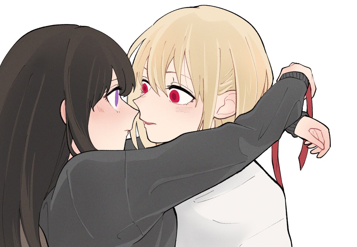 2girls arms_around_neck black_hair black_shirt blonde_hair closed_mouth commentary eye_contact holding holding_ribbon inoue_takina long_hair looking_at_another lycoris_recoil medium_hair multiple_girls nishikigi_chisato parted_lips purple_eyes red_eyes red_ribbon ribbon shiratama_draw shirt simple_background upper_body white_background white_shirt yuri