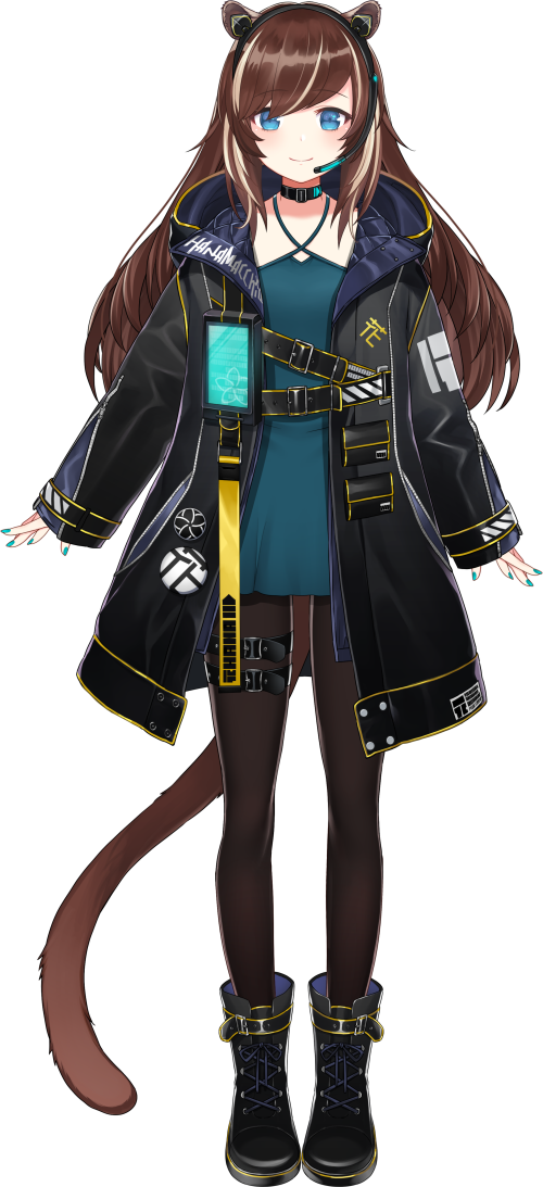 1girl animal_ears anonymous_(nijisanji) belt belt_buckle black_belt black_choker black_jacket black_pantyhose blue_dress blue_eyes blue_nails boots brown_hair buckle character_name choker dress floral_print full_body gold_trim hana_macchia hana_macchia_(2nd_costume) headset hood hooded_jacket jacket long_hair long_sleeves looking_at_viewer multicolored_hair nail_polish nijisanji nijisanji_id official_alternate_costume official_art pantyhose pouch sakuramon sleeves_past_wrists smile solo streaked_hair swept_bangs tachi-e tactical_clothes tail techwear transparent_background virtual_youtuber white_hair wristband