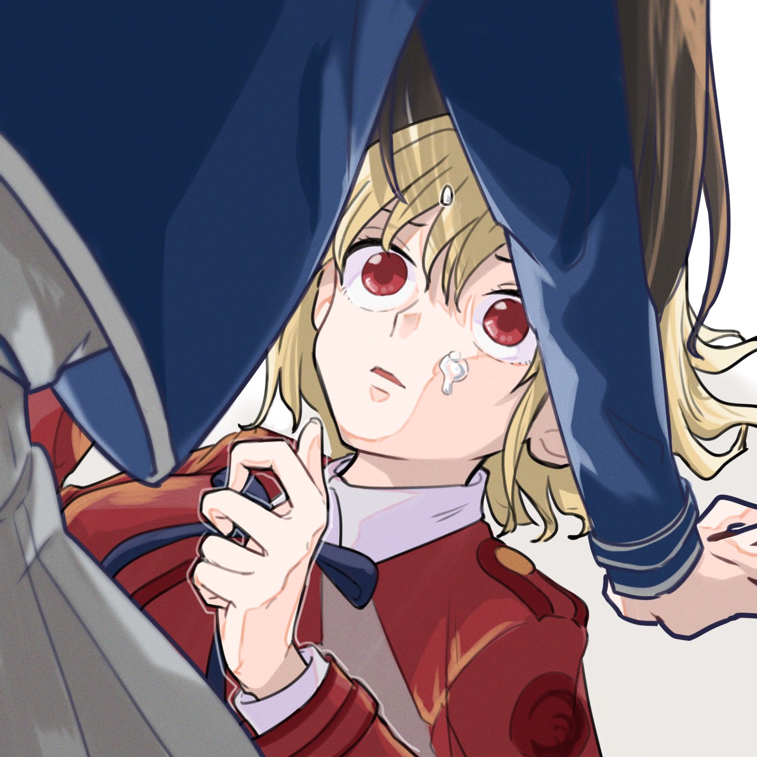 2girls blonde_hair blue_dress brown_hair commentary_request crying dress highres inoue_takina long_hair lycoris_recoil lycoris_uniform lying medium_hair multiple_girls nishikigi_chisato on_back parted_lips red_dress red_eyes shiratama_draw simple_background straddling tears white_background