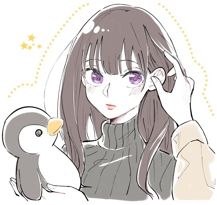 2girls black_sweater blush brown_hair closed_mouth commentary_request ear_blush female_pov holding holding_stuffed_toy inoue_takina long_hair looking_at_viewer lycoris_recoil multiple_girls nishikigi_chisato pov purple_eyes ribbed_sweater shiratama_draw simple_background star_(symbol) stuffed_animal stuffed_penguin stuffed_toy sweater turtleneck turtleneck_sweater upper_body white_background