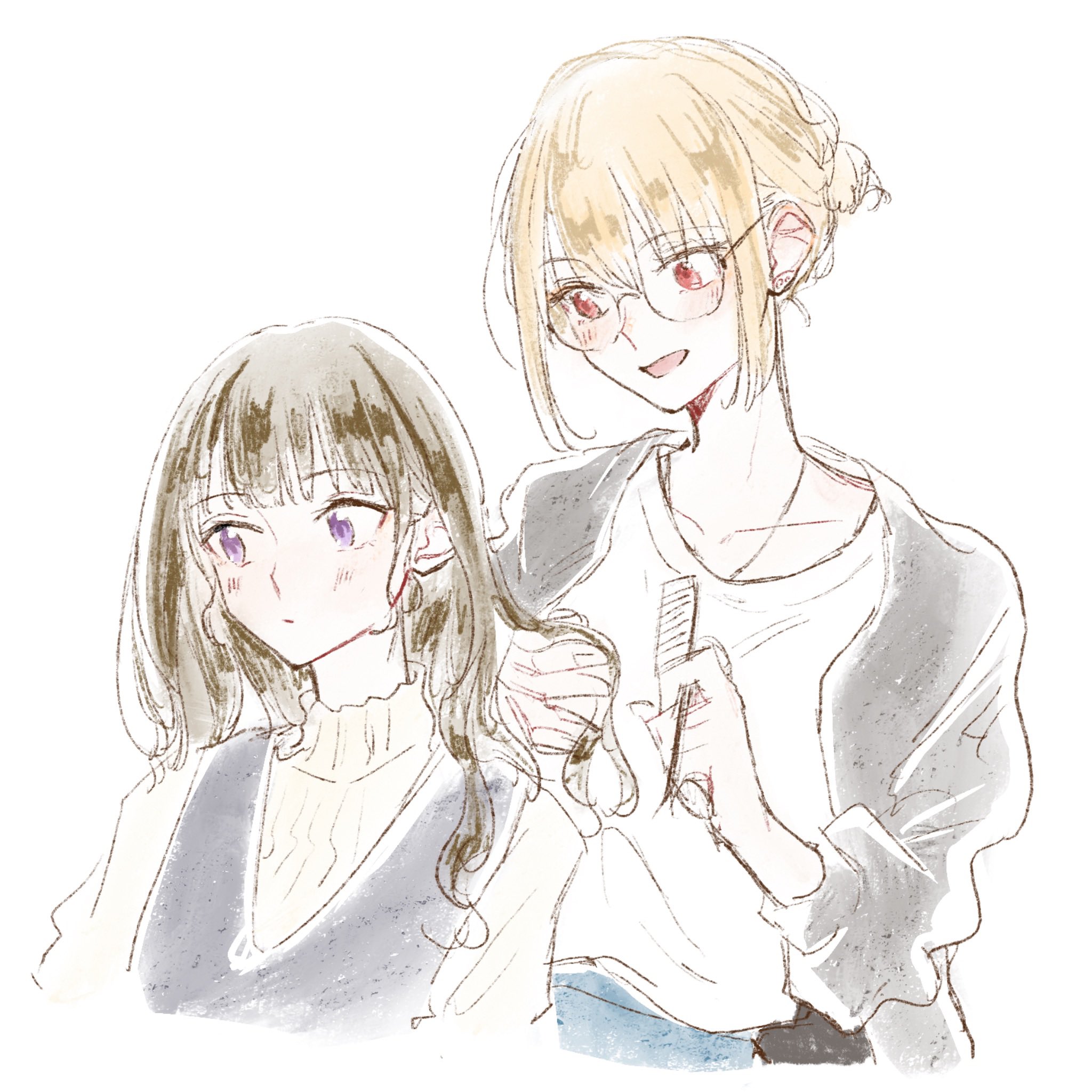 2girls black_hair black_jacket blonde_hair blush brushing_another's_hair brushing_hair closed_mouth comb commentary_request glasses hair_up highres holding holding_comb inoue_takina jacket jewelry long_hair lycoris_recoil multiple_girls necklace nishikigi_chisato open_clothes open_jacket open_mouth purple_eyes red_eyes shiratama_draw shirt smile white_shirt