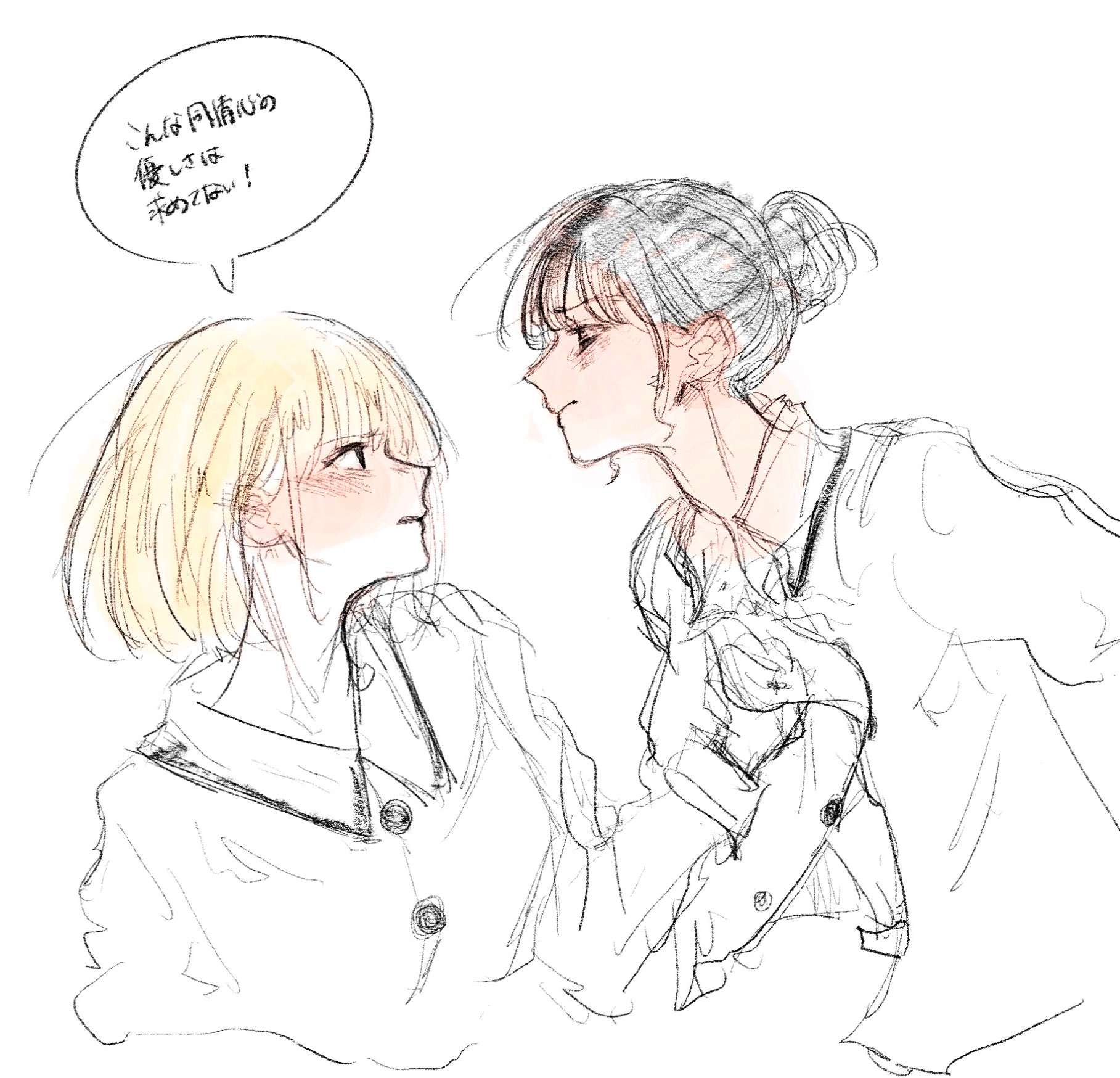 2girls black_hair blonde_hair blush collared_shirt commentary_request hair_bun hair_up hand_on_another's_chest highres inoue_takina long_sleeves looking_at_another lycoris_recoil medium_hair multiple_girls nishikigi_chisato parted_lips partially_colored shiratama_draw shirt simple_background sketch speech_bubble translation_request upper_body white_background