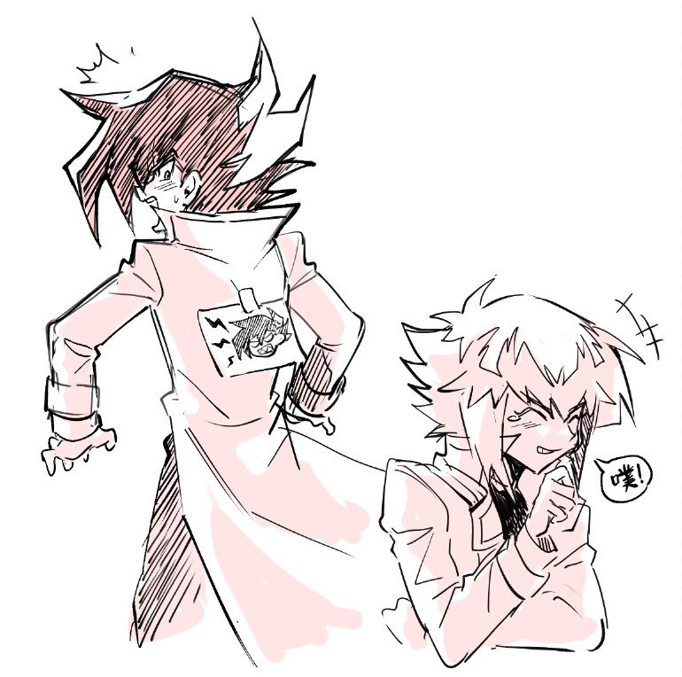 2boys ^^^ ^_^ blush closed_eyes coat cropped_legs embarrassed hair_between_eyes joyfullegs laughing long_sleeves male_focus manjoume_jun monochrome multiple_boys note_on_back pink_theme prank sanpaku shirt short_hair shout_lines sketch spiked_hair standing stifled_laugh thick_eyebrows translation_request yu-gi-oh! yu-gi-oh!_gx yuki_judai