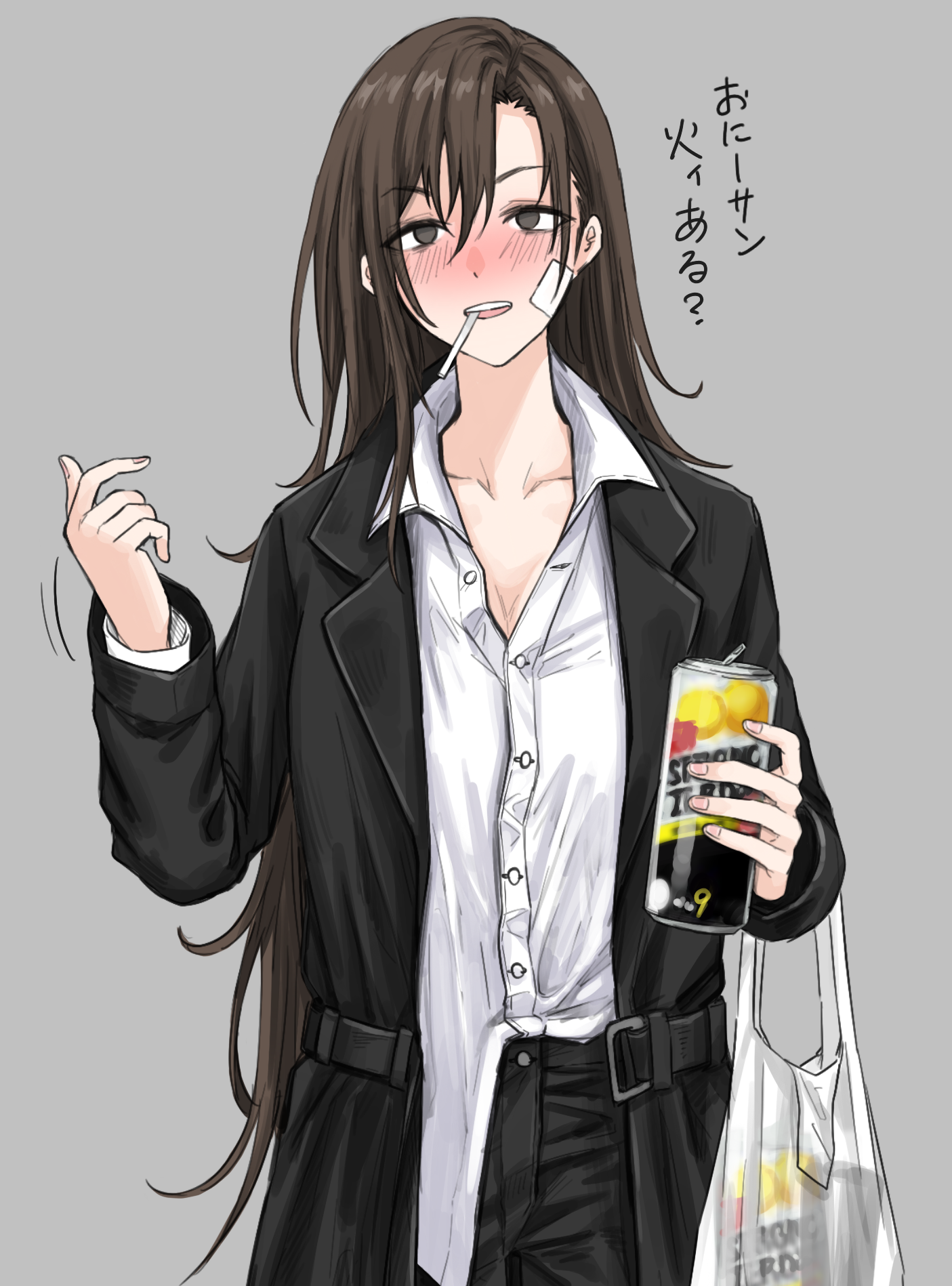 1girl alcohol bag bandaid bandaid_on_face black_coat blush breasts brown_eyes brown_hair can cigarette cleavage coat detective dress_shirt fuku_(fuku12290574) highres holding holding_can long_hair long_sleeves looking_at_viewer medium_breasts original partially_unbuttoned plastic_bag shirt simple_background smoking solo strong_zero unkempt very_long_hair