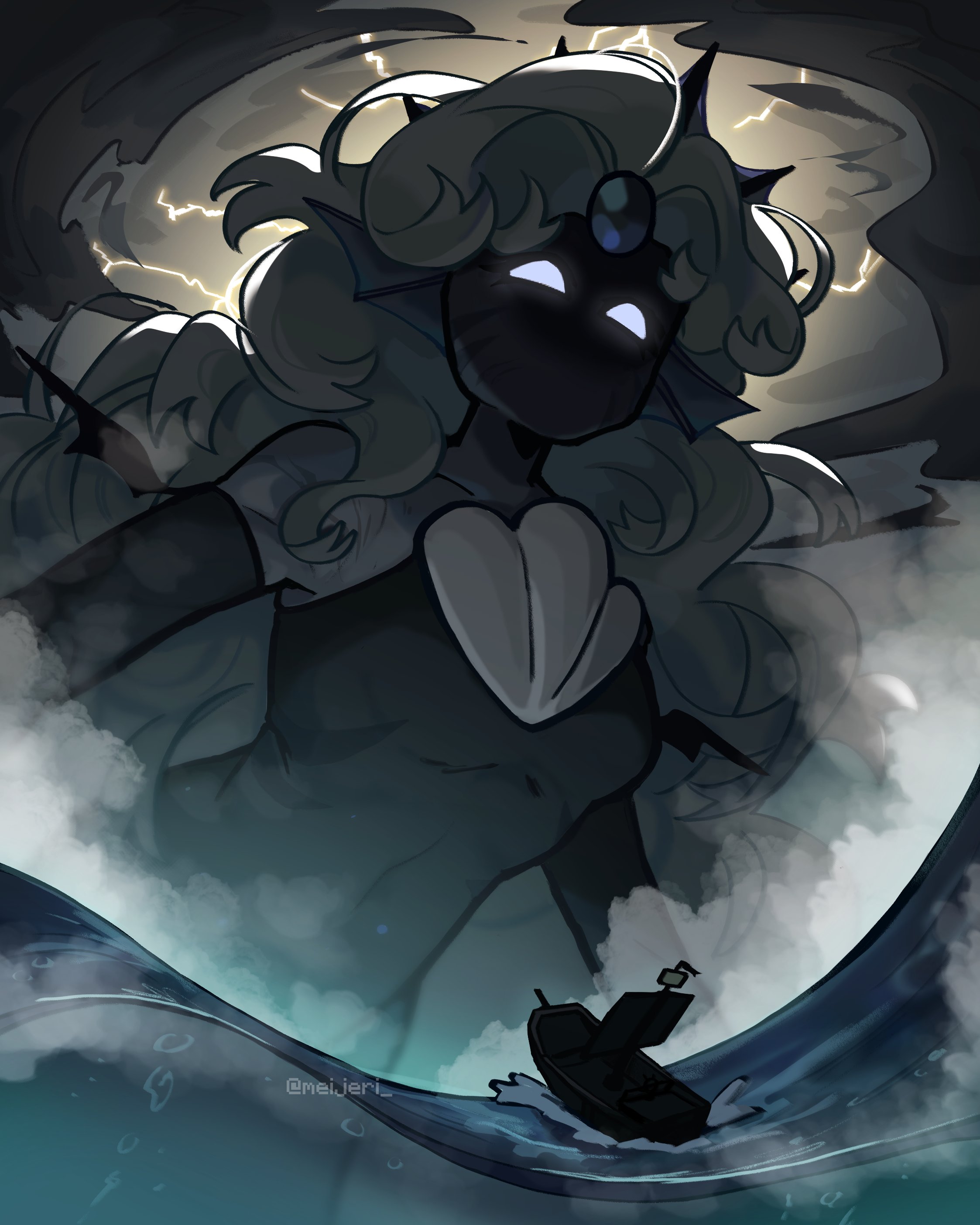 1girl absurdres black_gem black_pearl_cookie black_tiara cookie_run cookie_run:_kingdom fins gem giant giantess glowing glowing_eyes head_fins highres long_hair meijeri mermaid monster_girl ocean solo tiara very_long_hair white_hair