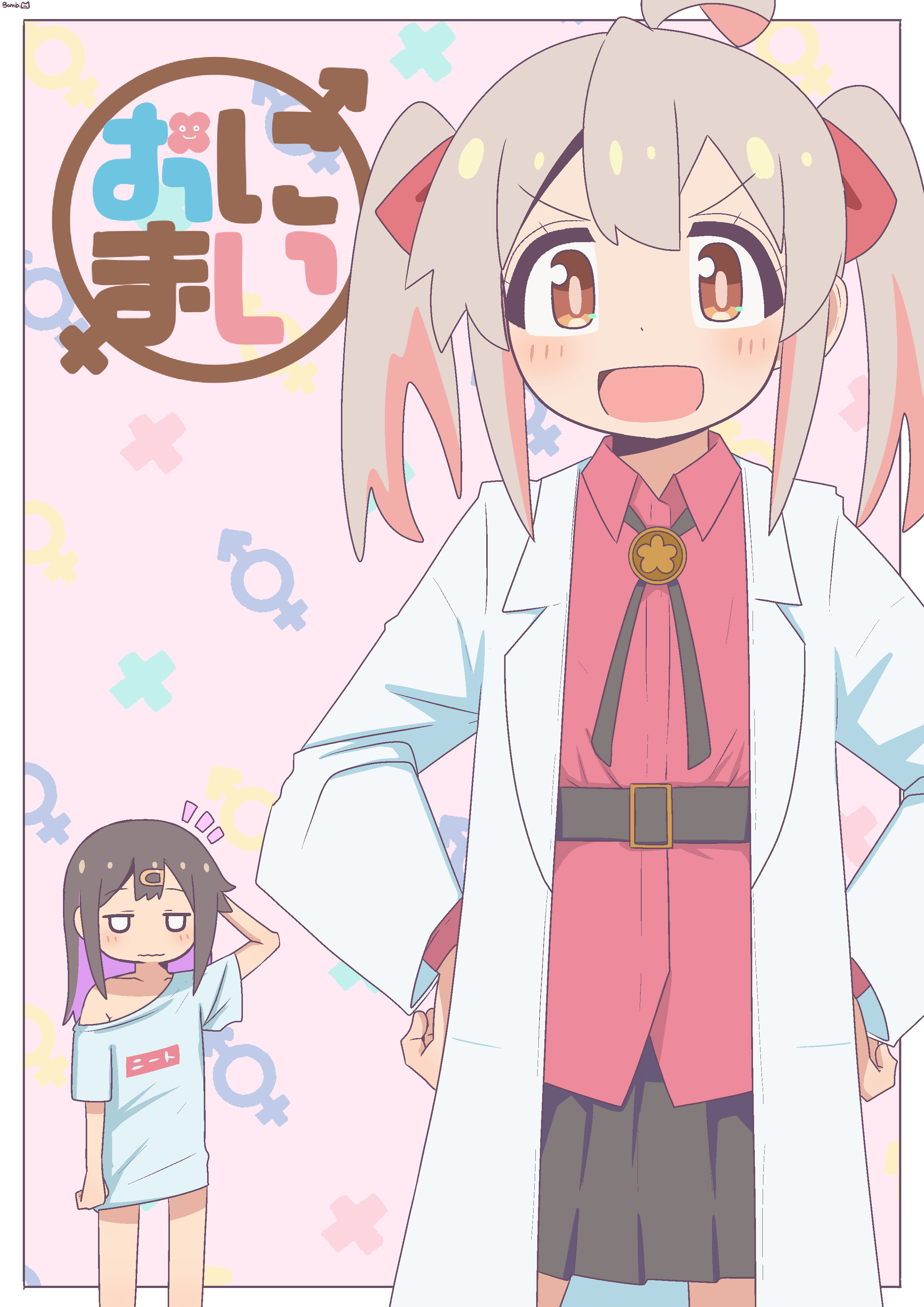 2girls :d absurdres ahoge alternate_hairstyle bambi2000line belt black_hair black_skirt bolo_tie border brown_eyes coat colored_inner_hair commentary copyright_name cosplay costume_switch dot_nose facing_viewer genderswap genderswap_(mtf) grey_hair hair_ornament hair_ribbon hairclip hairstyle_switch hands_on_own_hips highres jitome lab_coat light_blush logo long_hair long_sleeves looking_at_viewer male-female_symbol medium_hair miniskirt multicolored_hair multiple_girls no_pants off_shoulder onii-chan_wa_oshimai! open_clothes open_coat open_mouth outside_border oyama_mahiro oyama_mahiro_(cosplay) oyama_mihari oyama_mihari_(cosplay) pink_background pink_hair pleated_skirt purple_hair red_ribbon red_shirt ribbon shirt short_sleeves siblings simple_background sisters skirt smile standing t-shirt twintails two-tone_hair untucked_shirt wavy_mouth white_border white_shirt wing_collar