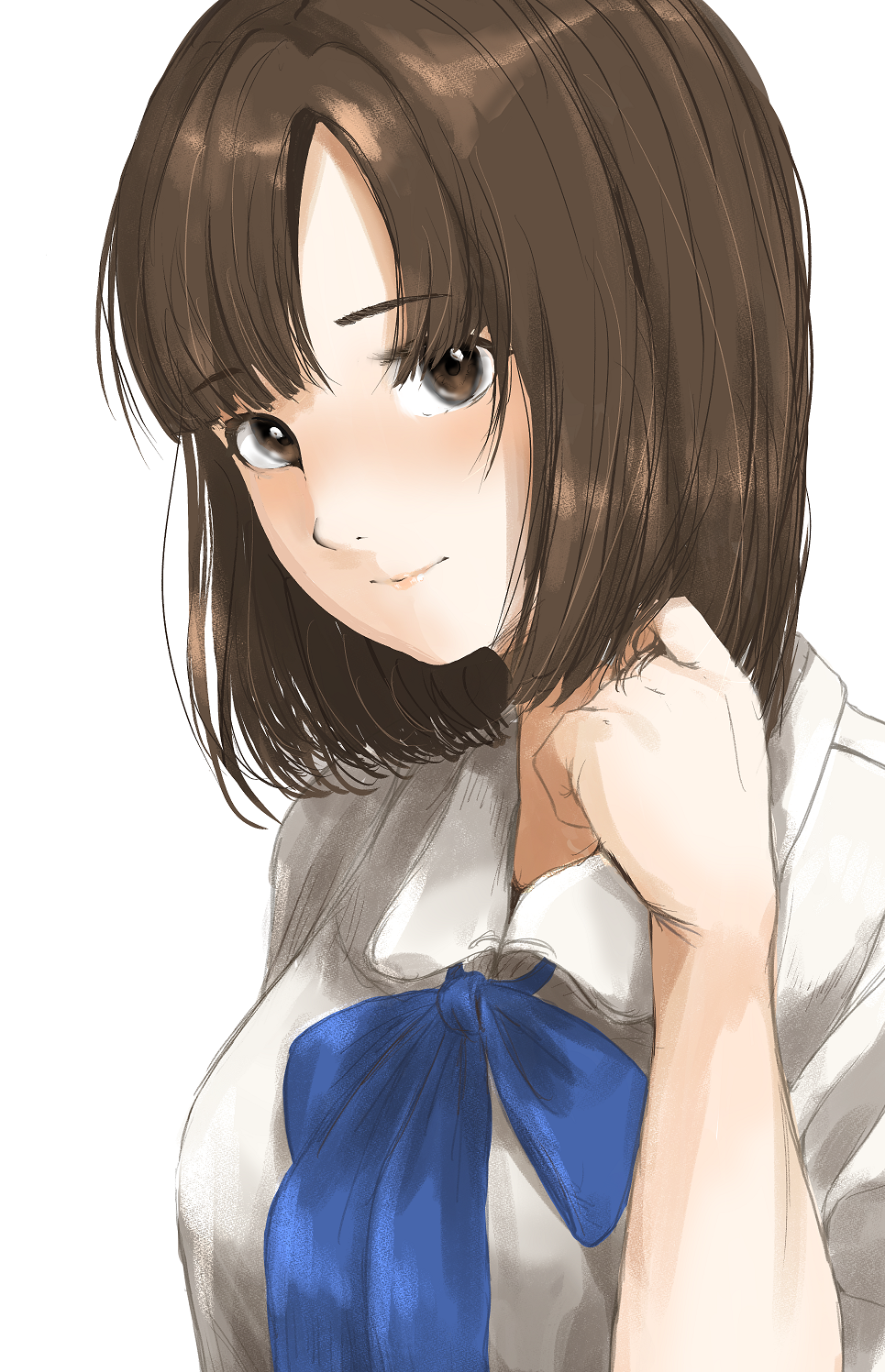 1girl alternate_hairstyle blue_ribbon blush brown_hair collared_shirt gatsby_ssl highres idolmaster idolmaster_cinderella_girls light_smile looking_at_viewer mizumoto_yukari neck_ribbon ribbon shirt short_hair simple_background solo upper_body white_background white_shirt
