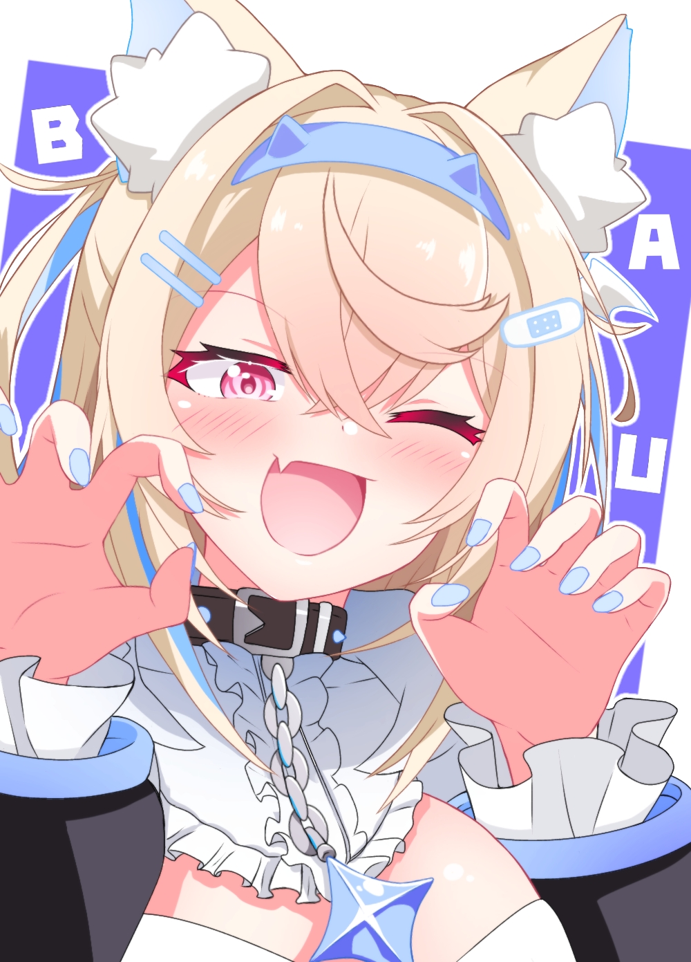 1girl animal_ear_fluff animal_ears belt_collar black_collar black_jacket blonde_hair blue_hair blue_nails blush collar dog_ears dog_girl dress fur-trimmed_jacket fur_trim fuwawa_abyssgard fuwawa_abyssgard_(1st_costume) highres hololive hololive_english jacket long_hair looking_at_viewer multicolored_hair nail_polish one_eye_closed open_mouth pink_eyes satouno_maya smile solo spiked_collar spikes streaked_hair two_side_up virtual_youtuber white_dress