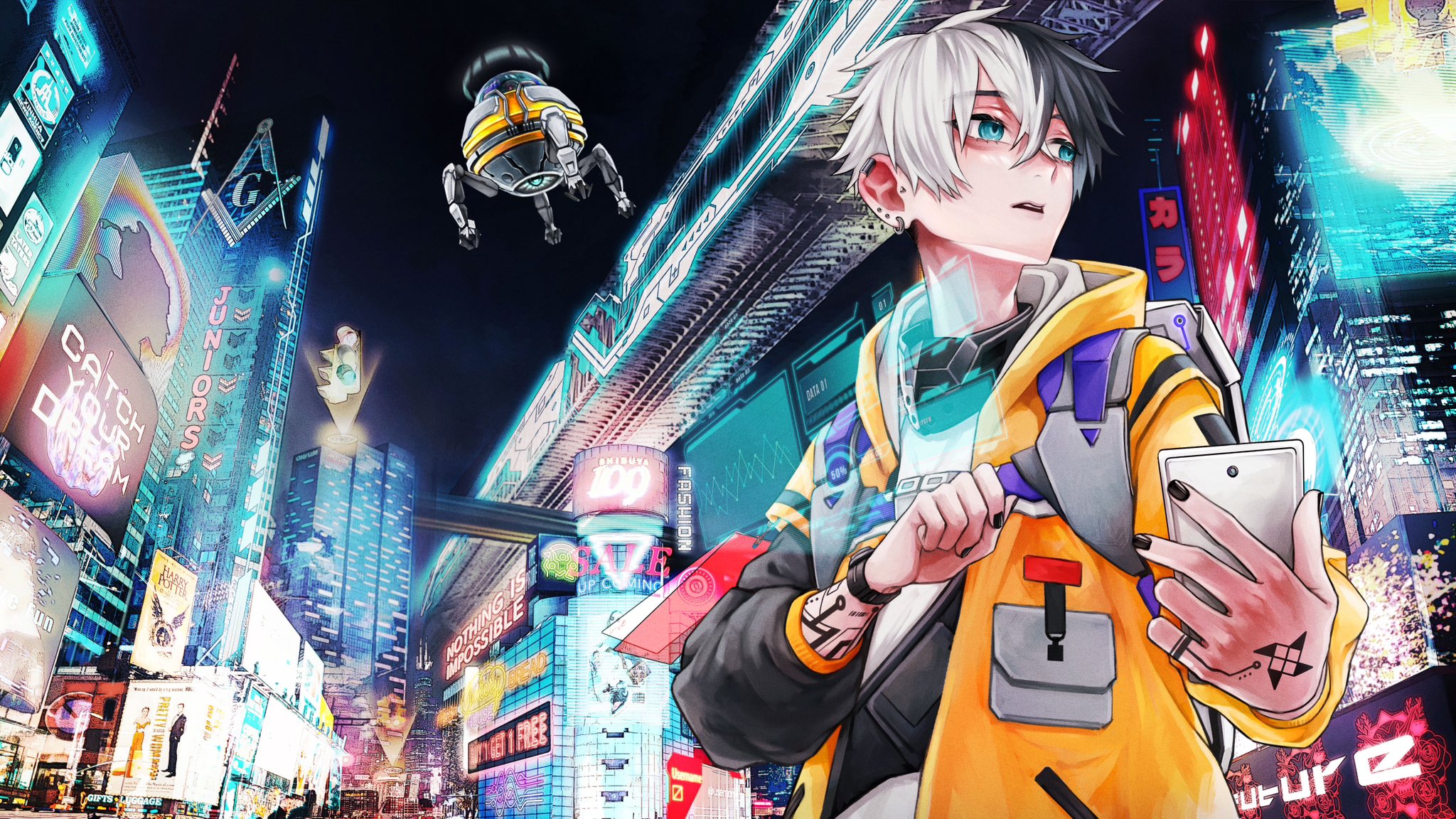 1boy banner billboard black_hair black_nails blue_eyes building city city_lights commentary ear_piercing earrings english_text eyelashes from_below hair_between_eyes hand_tattoo harry_potter_(series) highres holding holding_phone hood hoodie jewelry long_sleeves looking_to_the_side male_focus multicolored_hair neon_lights night open_clothes open_hoodie original parted_lips phone piercing poster_(object) robot scenery science_fiction shibuya_(tokyo) shibuya_109 short_hair sign sky skyscraper split-color_hair tattoo tokyo_(city) traffic_light upper_body white_hair wizarding_world xxx_akc yellow_hoodie