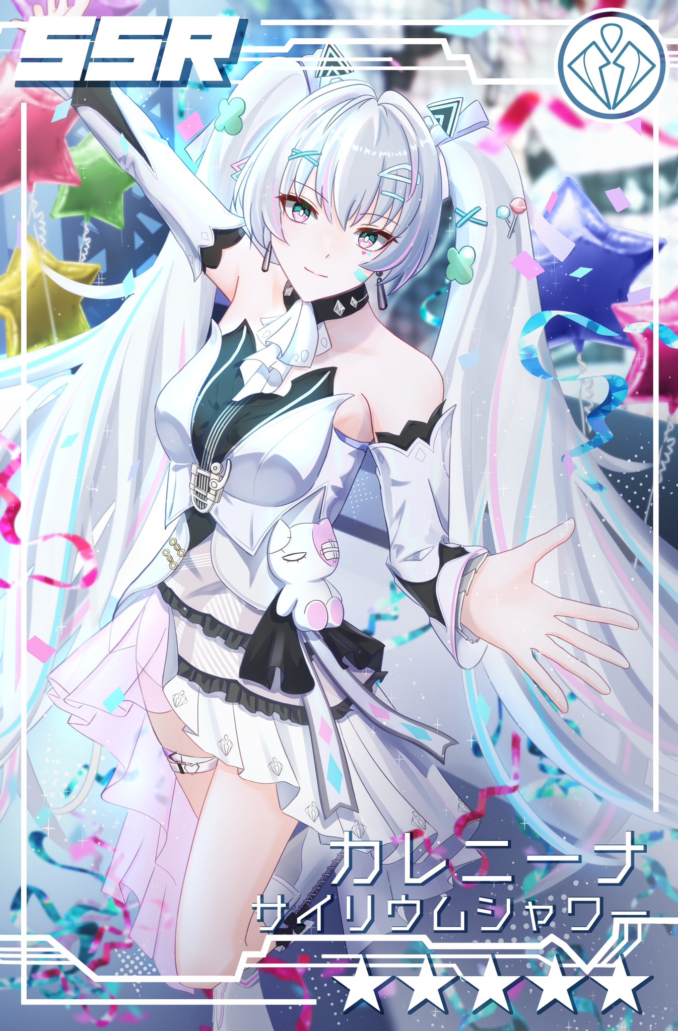 1girl ascot bare_shoulders black_dress black_sleeves detached_sleeves dress earrings floating_headgear green_eyes green_hair grey_hair hair_ornament hairclip headgear highres idol jewelry karenina:_scire_(neon_dynamite)_(pgr) karenina:_scire_(pgr) karenina_(pgr) layered_dress layered_sleeves lollipop_hair_ornament long_hair long_sleeves multicolored_eyes multicolored_hair nmnmpngr official_alternate_costume pink_eyes pink_hair punishing:_gray_raven sidelocks streaked_hair stuffed_animal stuffed_cat stuffed_toy two-tone_dress two-tone_eyes two-tone_sleeves very_long_hair white_ascot white_dress white_sleeves x_hair_ornament