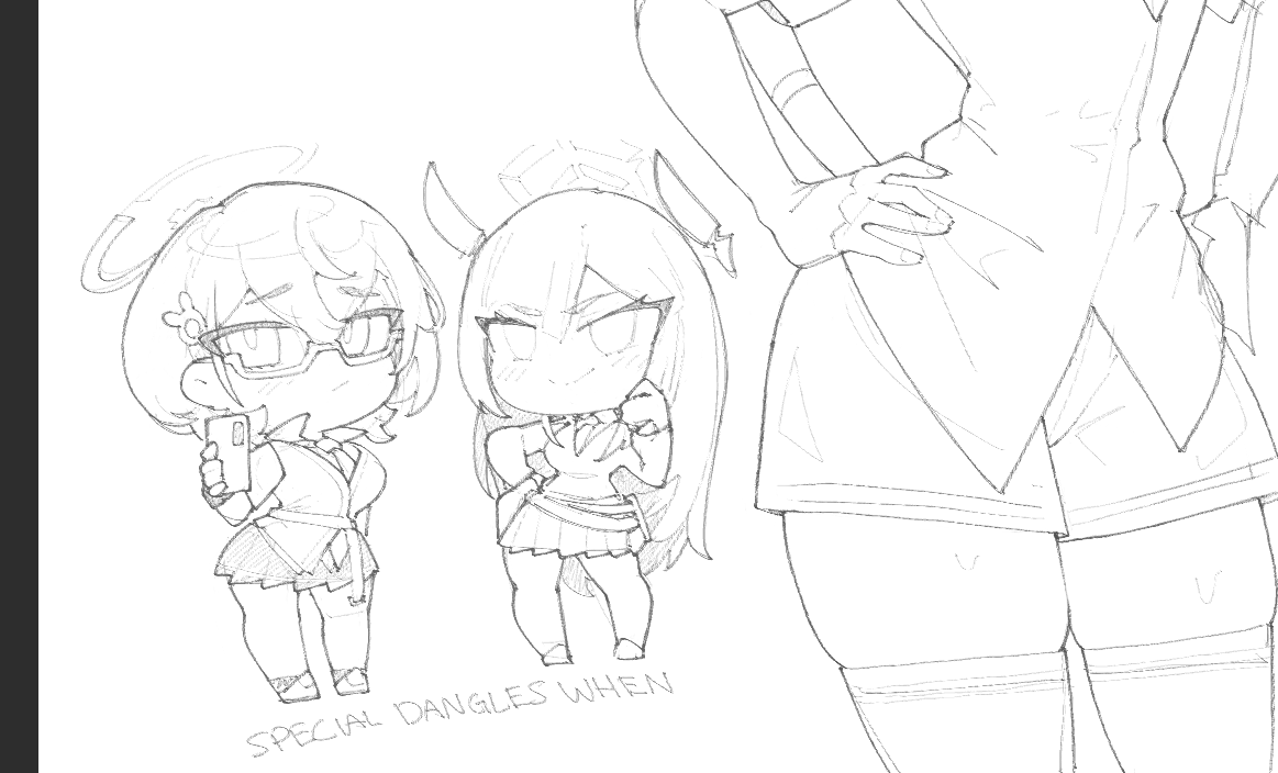 3girls blue_archive character_request chibi chihiro_(blue_archive) drawfag monochrome multiple_girls sketch skirt smile thick_eyelashes thick_thighs thighs utaha_(blue_archive)