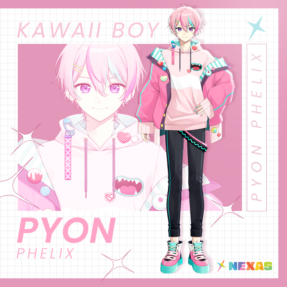 1boy black_pants blue_hair blue_nails buttons character_name closed_mouth commentary dot_nose drawstring english_commentary english_text full_body grid hair_ornament hairclip hand_on_own_hip heart_button hood hoodie konogi_nogi logo male_focus medium_hair messy_hair multicolored_hair multicolored_nails nexas_(vtuber) official_art pants pink_hair pink_hoodie pink_nails pink_shoes purple_eyes pyon_phelix safety_pin shoes smile standing streaked_hair two-tone_hair virtual_youtuber