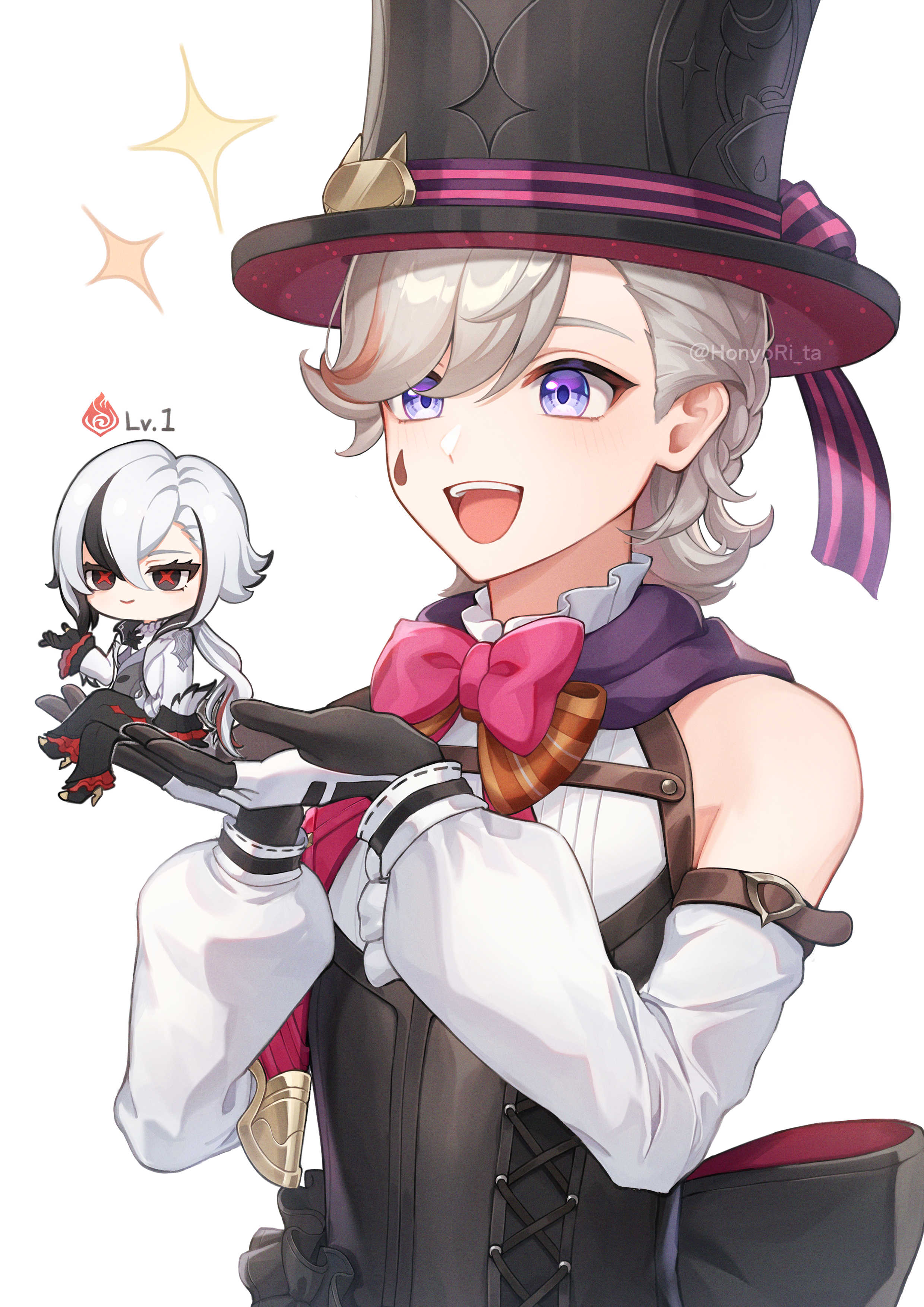 1boy 1girl absurdres arlecchino_(genshin_impact) black_eyes black_gloves black_hair black_hat black_pants blonde_hair bow bowtie character_doll doll facial_mark genshin_impact gloves hair_between_eyes hat highres hn_(honyori_ta) jacket long_sleeves looking_at_viewer lyney_(genshin_impact) male_focus multicolored_hair open_mouth pants pink_bow pink_bowtie purple_eyes red_hair red_pupils shirt short_hair streaked_hair symbol-shaped_pupils teardrop_facial_mark teeth tongue top_hat white_hair white_jacket white_shirt x-shaped_pupils