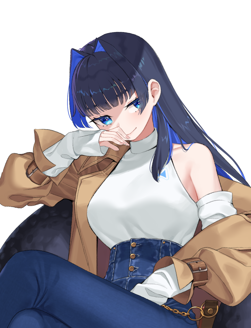 1girl bare_shoulders bent_over black_hair blue_eyes blue_hair blue_pants blunt_bangs breasts brown_coat coat colored_inner_hair denim hair_intakes high-waist_pants highres hololive hololive_english jeans kam-ja large_breasts long_hair long_sleeves multicolored_hair official_alternate_costume official_alternate_hair_length official_alternate_hairstyle ouro_kronii ouro_kronii_(casual) pants solo sweater sweater_tucked_in trench_coat turtleneck virtual_youtuber white_sweater