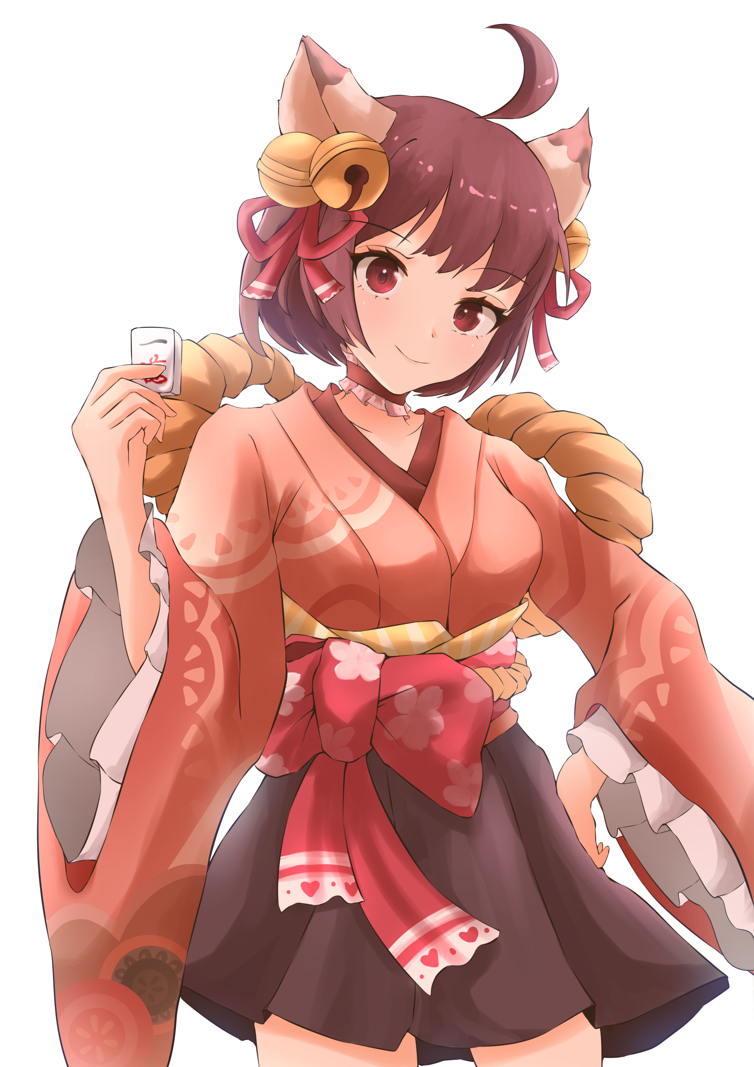 1girl absurdres ahoge animal_ears b1ack_illust bell blush breasts brown_hair brown_skirt cape cat_ears cat_girl choker closed_mouth commentary_request cowboy_shot frilled_choker frilled_sleeves frills hair_bell hair_ornament hair_ribbon head_tilt highres holding holding_mahjong_tile ichihime japanese_clothes jingle_bell kimono long_sleeves looking_at_viewer mahjong mahjong_soul mahjong_tile pink_kimono red_cape red_eyes red_ribbon ribbon short_hair simple_background skirt small_breasts smile solo white_background wide_sleeves