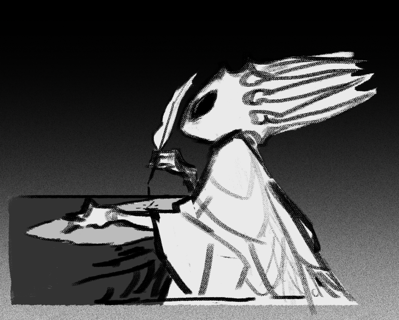 1other black_background cloak ded-lime grey_background greyscale holding holding_quill hollow_eyes hollow_knight horns monochrome pale_king_(hollow_knight) quill robe solo white_cloak white_robe writing