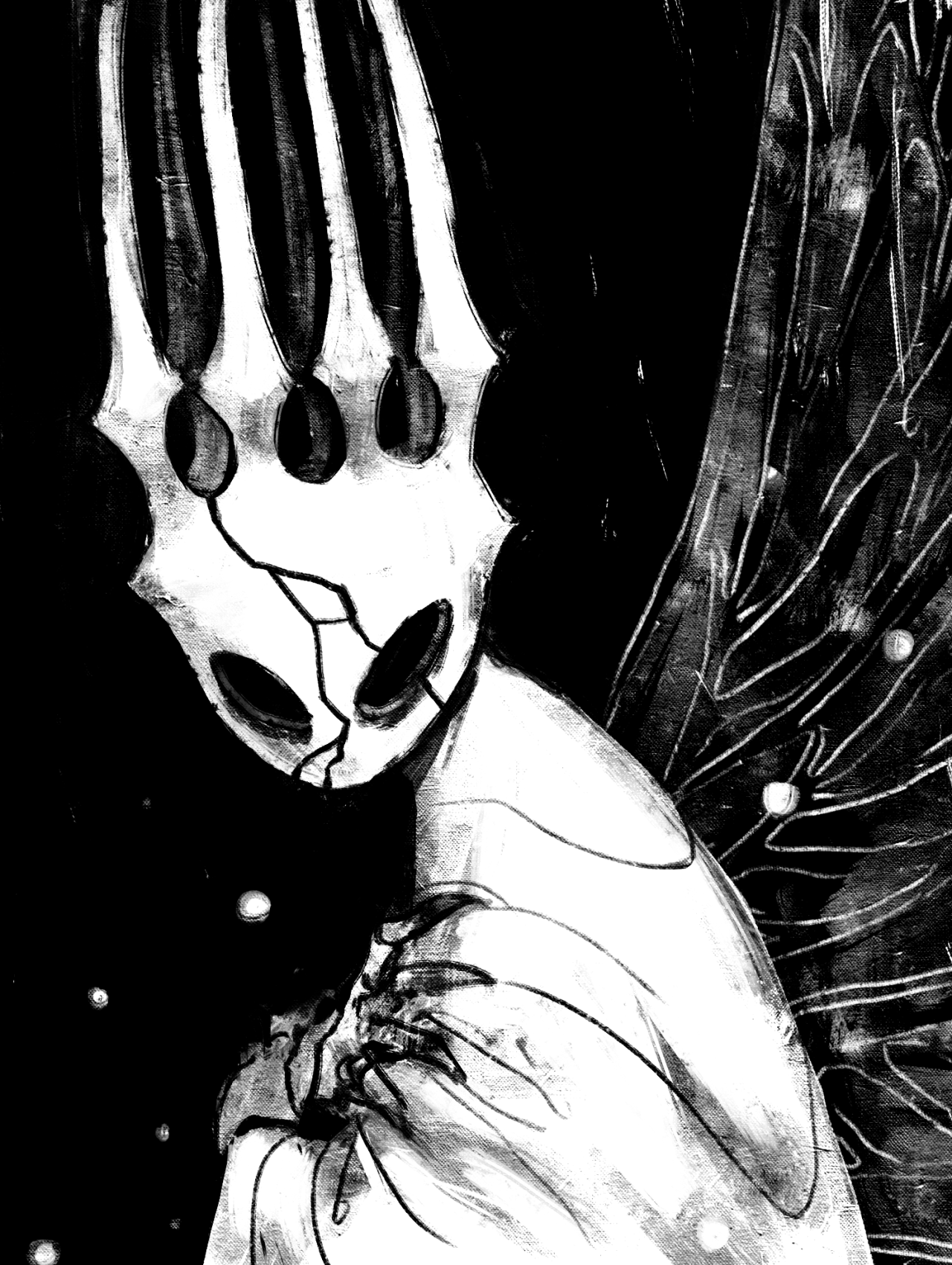 1other black_background broken butterfly_wings cloak crack crown ded-lime fingernails grey_background greyscale highres hollow_eyes hollow_knight horns insect_wings monochrome pale_king_(hollow_knight) robe solo white_cloak white_robe wings