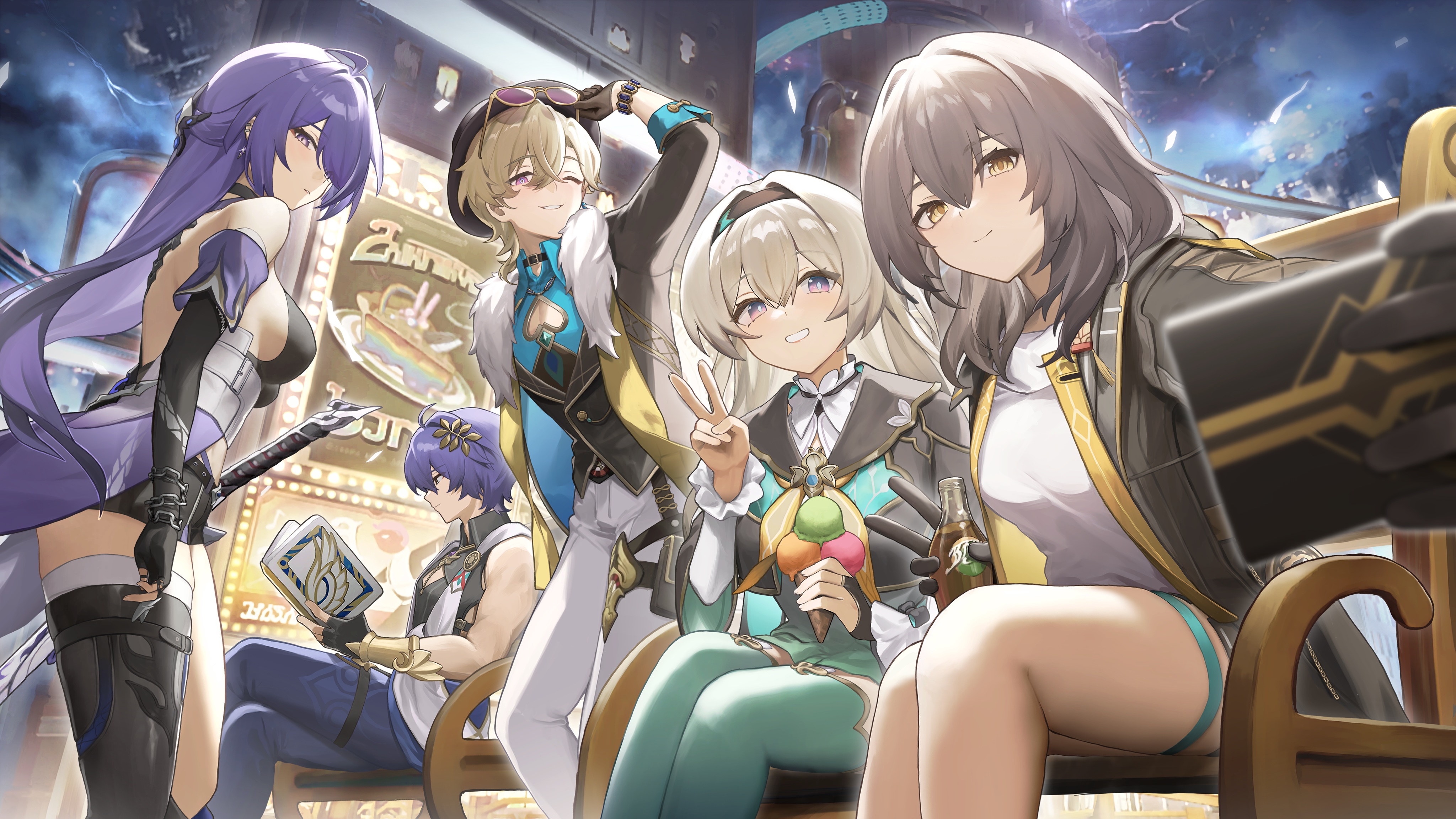 2boys 3girls absurdres acheron_(honkai:_star_rail) asymmetrical_legwear aventurine_(honkai:_star_rail) bandaged_leg bandages bare_shoulders bench black_choker black_jacket black_shorts blue_pants book bottle breasts choker coat dr._ratio_(honkai:_star_rail) firefly_(honkai:_star_rail) fur-trimmed_jacket fur_trim green_thighhighs grey_hair hair_ornament hair_over_one_eye highres holding holding_bottle holding_removed_eyewear honkai:_star_rail honkai_(series) jacket katana large_breasts looking_at_viewer midriff_peek multicolored_hair multiple_boys multiple_girls one_eye_closed open_clothes open_jacket pants phone purple_eyes purple_hair reading seallllion selfie shirt shorts sitting smile stelle_(honkai:_star_rail) streaked_hair sunglasses sword thigh_strap thighhighs thighs trailblazer_(honkai:_star_rail) unworn_eyewear v weapon white_coat white_pants white_shirt yellow_eyes