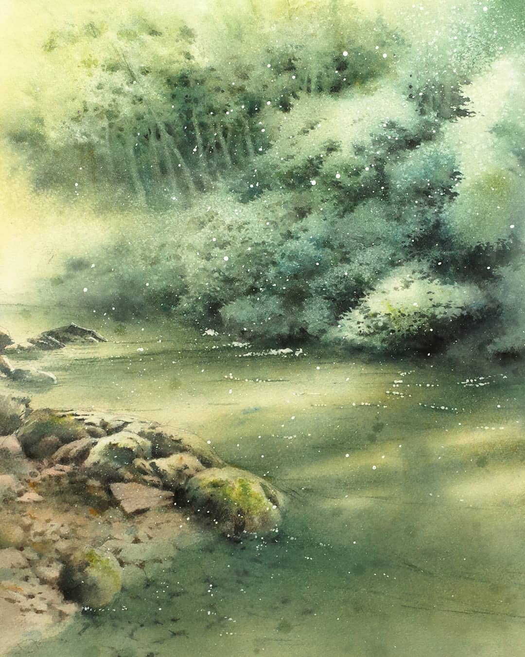 bush dappled_sunlight day forest grass highres leaf moss mud nature original painting_(medium) plant pond rock scenery shadow shimizu_megumi_(m_acquerello) sunlight traditional_media tree tree_shade water watercolor_(medium)