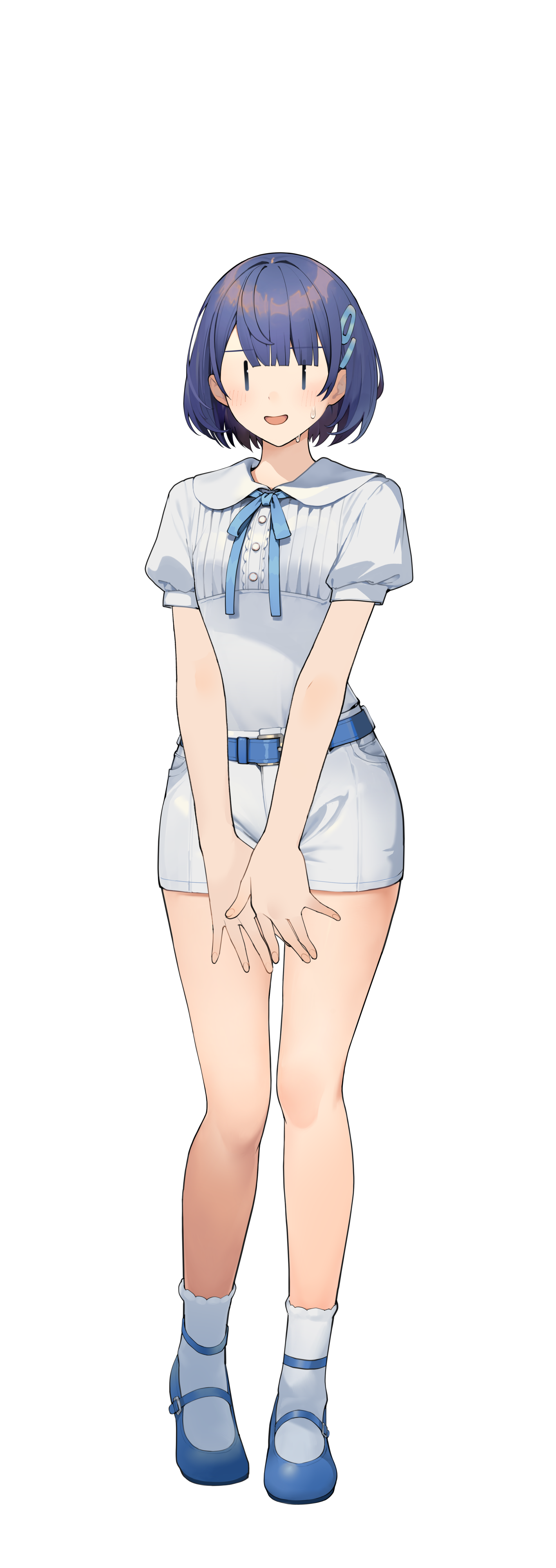 1girl absurdres belt belt_buckle blue_belt blue_hair blue_ribbon blue_shoes blunt_bangs blush buckle cevio collared_shirt commentary_request covering_crotch covering_privates dot_nose full_body hair_ornament hairclip highres large_variant_set looking_at_viewer mary_janes neck_ribbon parted_lips psd_available puffy_short_sleeves puffy_sleeves ribbon shirinda_fureiru shirt shirt_tucked_in shoes short_hair short_shorts short_sleeves shorts simple_background socks solo standing straight-on suzuki_tsudumi sweat tachi-e transparent_background variant_set white_shorts white_socks |_|