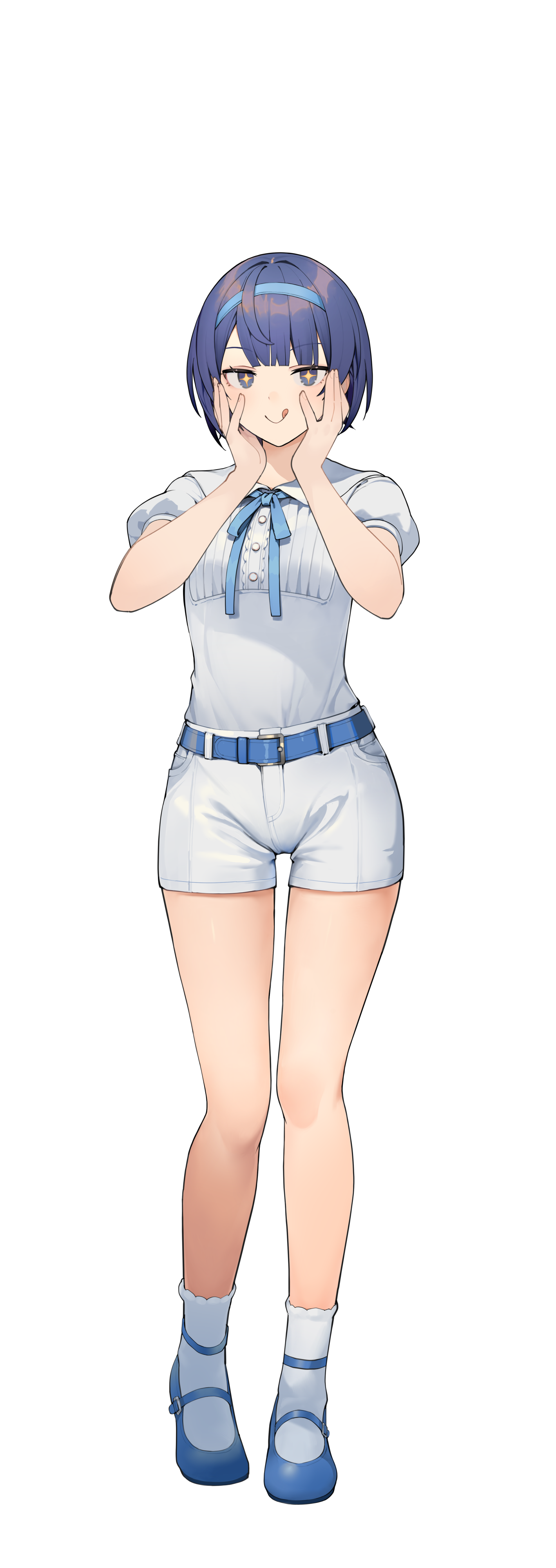 1girl :q absurdres belt belt_buckle blue_belt blue_eyes blue_hair blue_hairband blue_ribbon blue_shoes blunt_bangs buckle cevio collared_shirt commentary_request dot_nose full_body hairband hands_on_own_cheeks hands_on_own_face highres large_variant_set light_blush looking_at_viewer mary_janes neck_ribbon psd_available puffy_short_sleeves puffy_sleeves ribbon shirinda_fureiru shirt shirt_tucked_in shoes short_hair short_shorts short_sleeves shorts simple_background smug socks solo standing star_(symbol) star_in_eye straight-on suzuki_tsudumi symbol_in_eye tachi-e tongue tongue_out transparent_background variant_set white_shorts white_socks