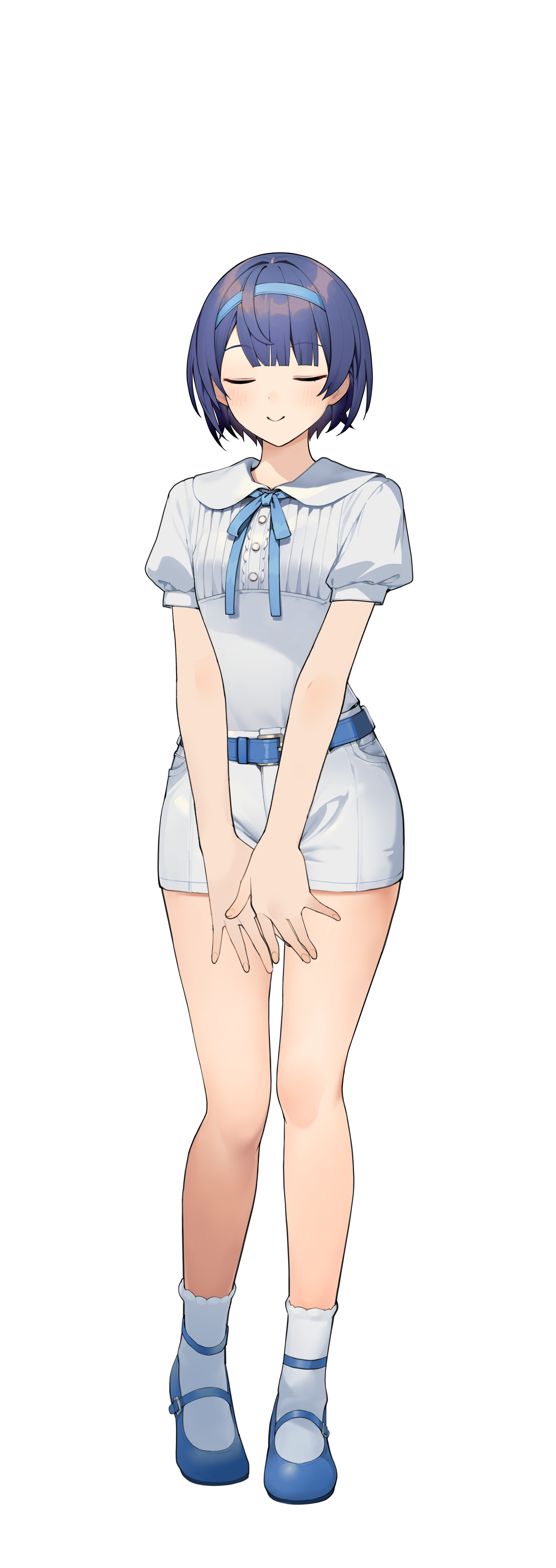 1girl absurdres belt belt_buckle blue_belt blue_hair blue_hairband blue_ribbon blue_shoes blunt_bangs blush buckle cevio closed_eyes closed_mouth collared_shirt commentary_request covering_crotch covering_privates dot_nose facing_viewer full_body hairband highres large_variant_set mary_janes neck_ribbon own_hands_together psd_available puffy_short_sleeves puffy_sleeves ribbon shirinda_fureiru shirt shirt_tucked_in shoes short_hair short_shorts short_sleeves shorts simple_background socks solo standing straight-on suzuki_tsudumi tachi-e transparent_background variant_set white_shorts white_socks