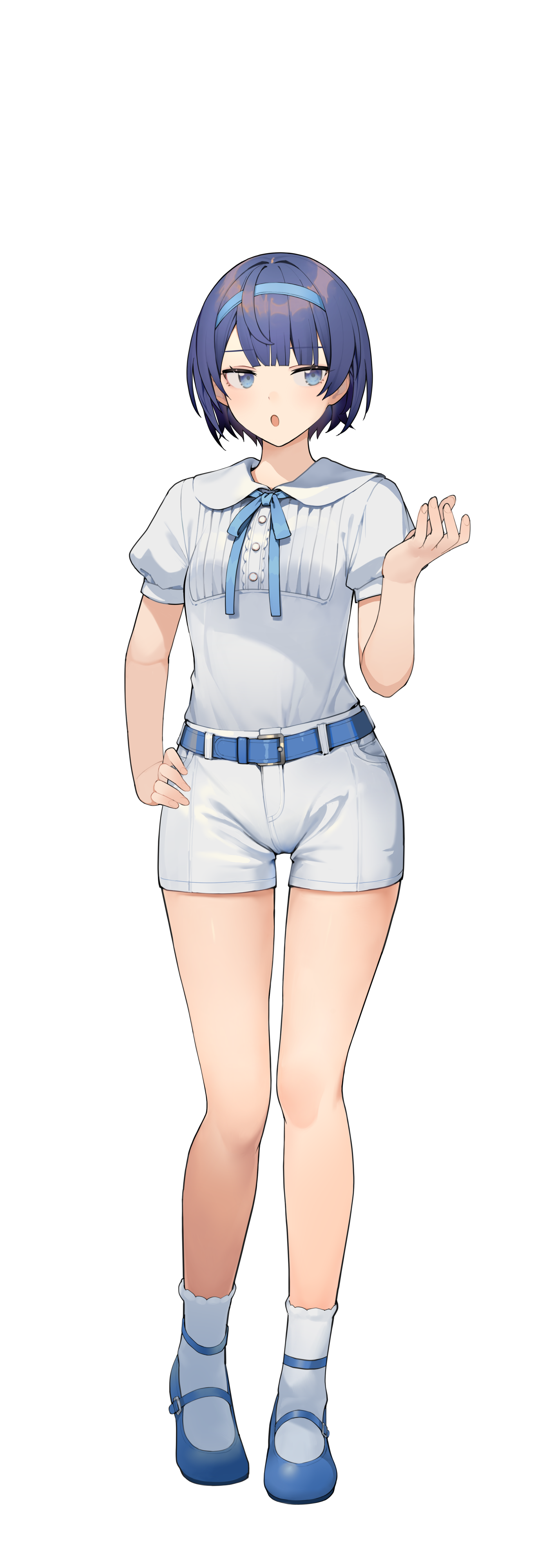1girl absurdres belt belt_buckle blue_belt blue_eyes blue_hair blue_hairband blue_ribbon blue_shoes blunt_bangs buckle cevio collared_shirt commentary_request dot_nose full_body hairband hand_on_own_hip hand_up highres large_variant_set light_blush mary_janes neck_ribbon parted_lips psd_available puffy_short_sleeves puffy_sleeves ribbon shirinda_fureiru shirt shirt_tucked_in shoes short_hair short_shorts short_sleeves shorts sideways_glance simple_background socks solo standing straight-on suzuki_tsudumi tachi-e transparent_background variant_set white_shorts white_socks