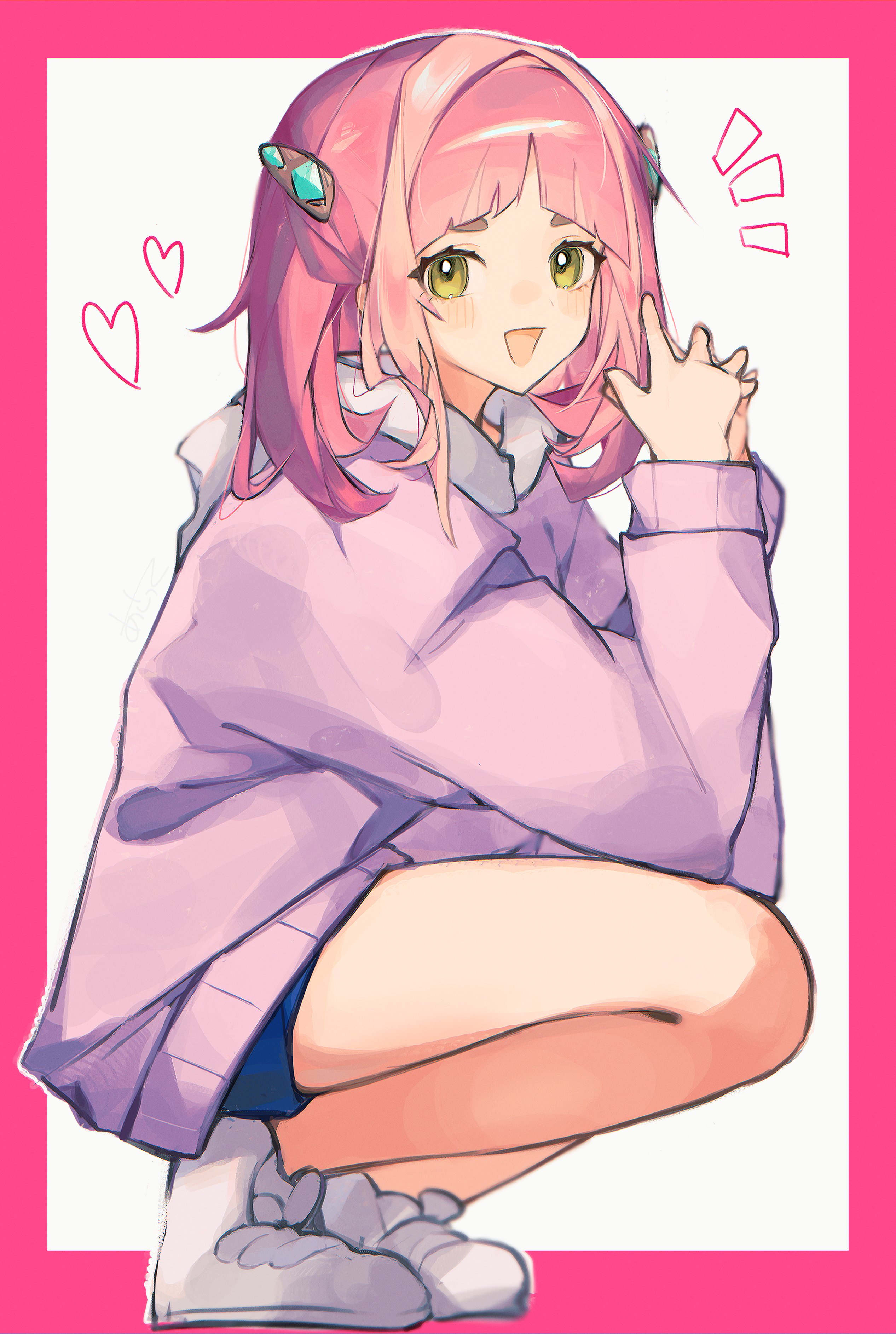 absurdres arched_bangs asatte_3z blueberry_academy_(emblem) blueberry_academy_school_uniform bolt_hair_ornament border cardigan heart highres lacey_(pokemon) medium_hair nintendo open_cardigan open_clothes open_mouth pink_border pink_hair pokemon pokemon_sv purple_cardigan school_uniform simple_background white_background white_footwear yellow_eyes