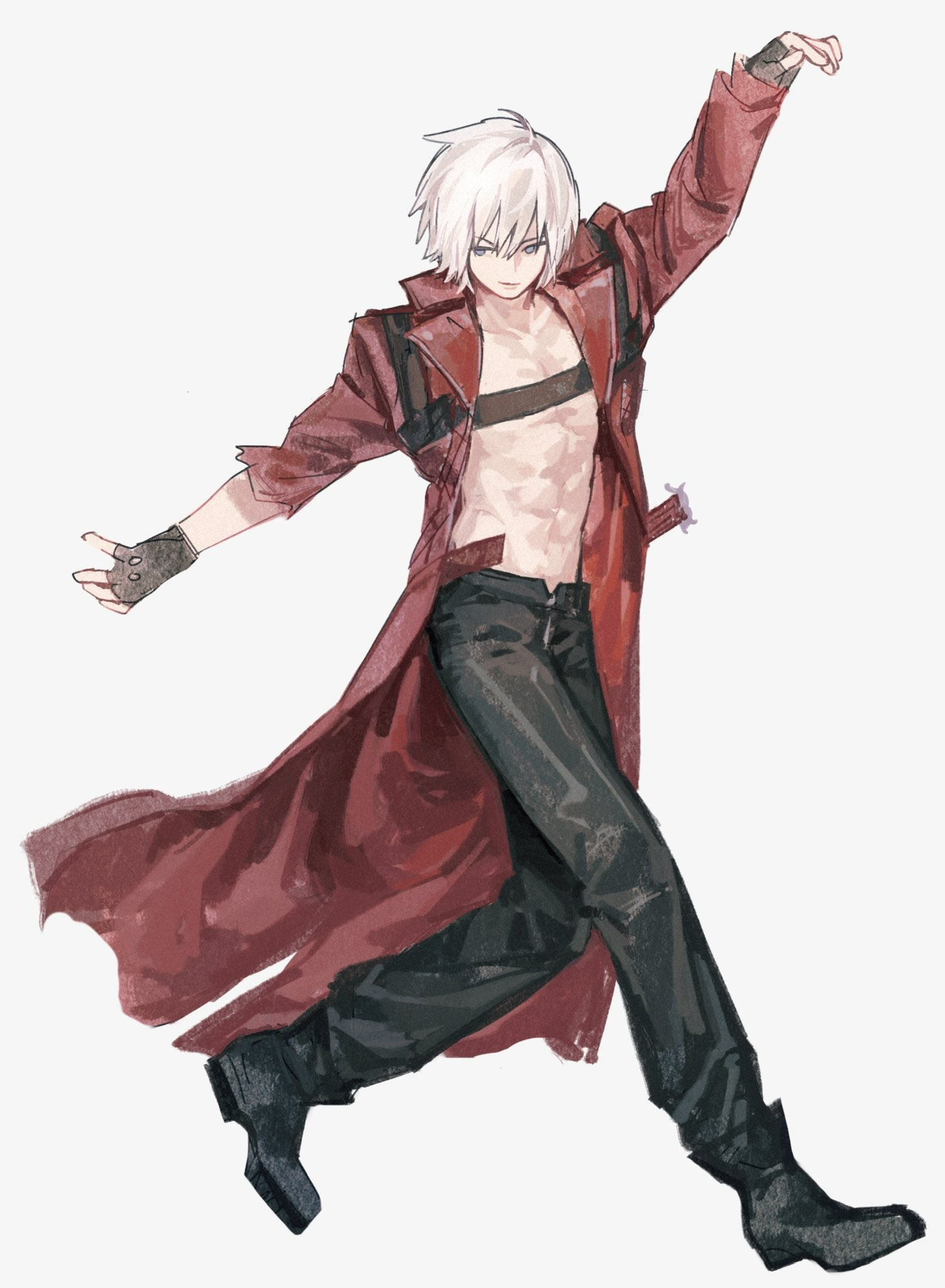 1boy belt_bra coat dante_(devil_may_cry) devil_may_cry devil_may_cry_(series) devil_may_cry_3 fingerless_gloves full_body gloves highres long_hair male_focus masukawagen red_coat simple_background solo upper_body white_background white_hair