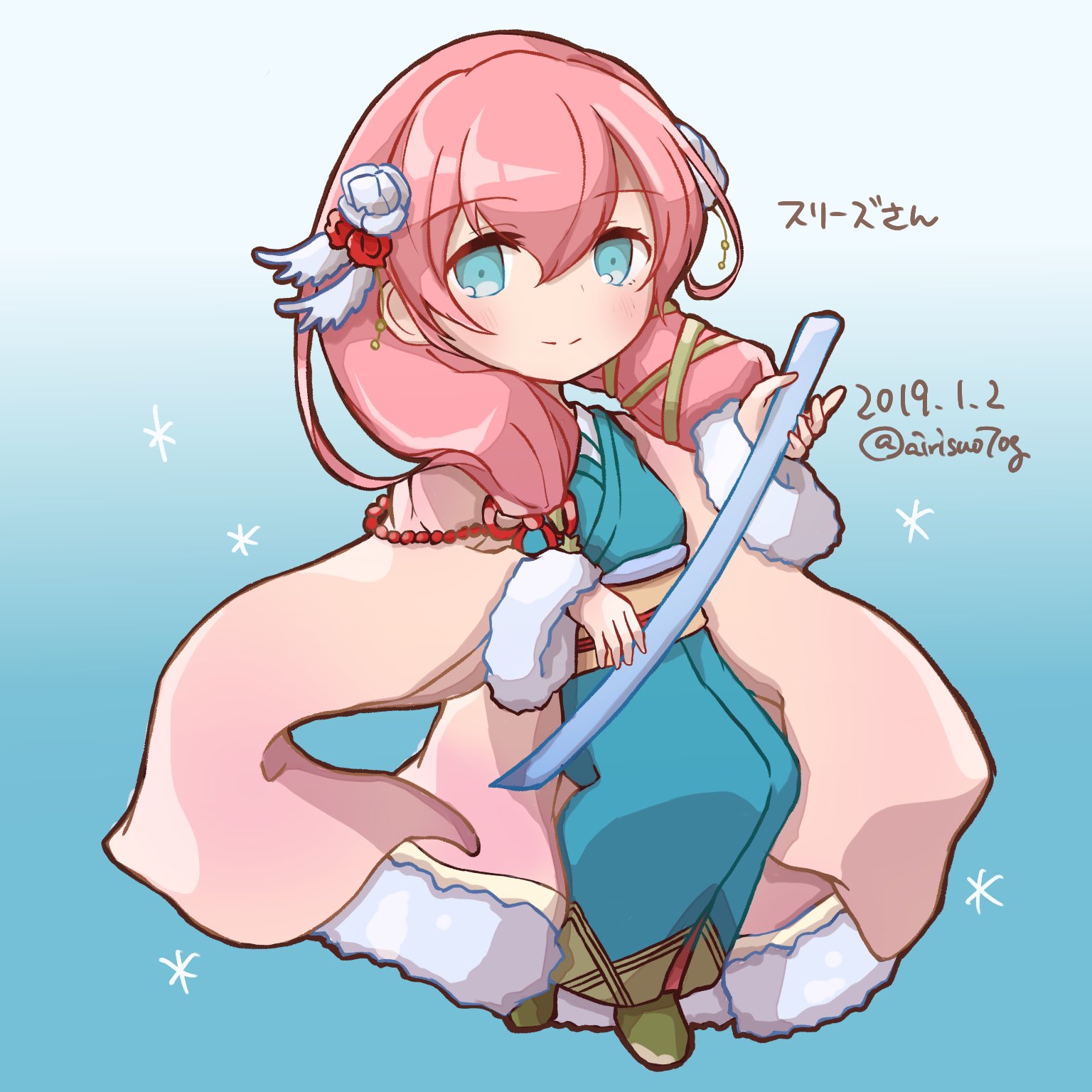 1girl airisuotog dated feather_trim fire_emblem fire_emblem_heroes flower fur_trim gradient_hair gunnthra_(fire_emblem) gunnthra_(new_year)_(fire_emblem) hair_flower hair_ornament highres japanese_clothes kimono multicolored_hair nintendo obi pink_hair sash snowflakes translation_request twitter_username wide_sleeves