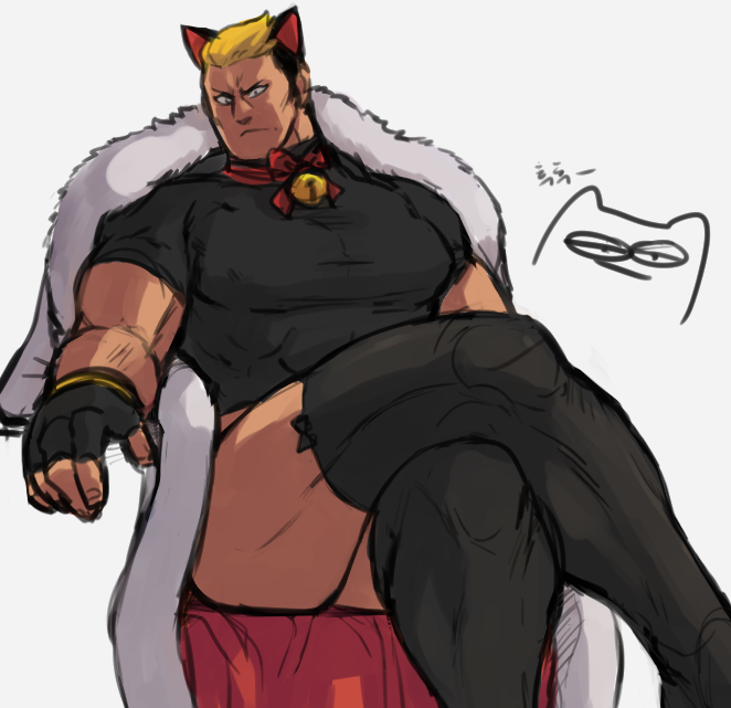 1boy animal_ears bara bell black_leggings blonde_hair bracelet breasts cat_ears coat confused crossed_legs fingerless_gloves fur-trimmed_coat fur_trim gloves gluteal_fold gold_bracelet hair_slicked_back jingle_bell large_breasts large_pectorals leggings male_focus muscular muscular_male nyaattoberritto pectorals red_ribbon ribbon sitting tan the_king_of_fighters thick_thighs thighhighs thighs white_background yamazaki_ryuuji