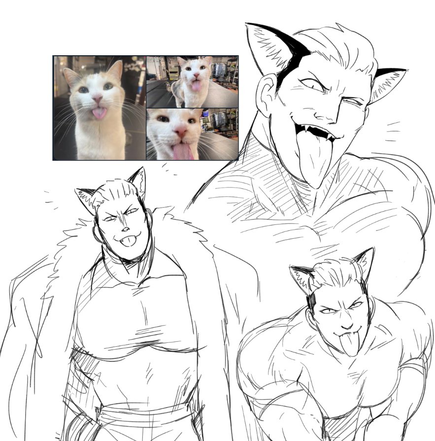 1boy animal_ears bara breasts cat_ears cat_png evil_grin evil_smile grin large_breasts large_pectorals meme muscular muscular_male naughty_face nyaattoberritto pectorals sketch smile the_king_of_fighters tongue tongue_out white_background yamazaki_ryuuji