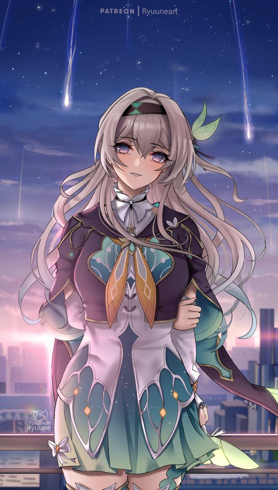 1girl aqua_skirt black_hairband black_jacket city commentary cowboy_shot firefly_(honkai:_star_rail) grey_hair grin hairband head_tilt highres honkai:_star_rail honkai_(series) jacket long_hair long_sleeves looking_at_viewer miniskirt neckerchief outdoors parted_lips purple_eyes ryuuneart shirt shooting_star skirt sky smile solo standing star_(sky) starry_sky very_long_hair white_shirt yellow_neckerchief