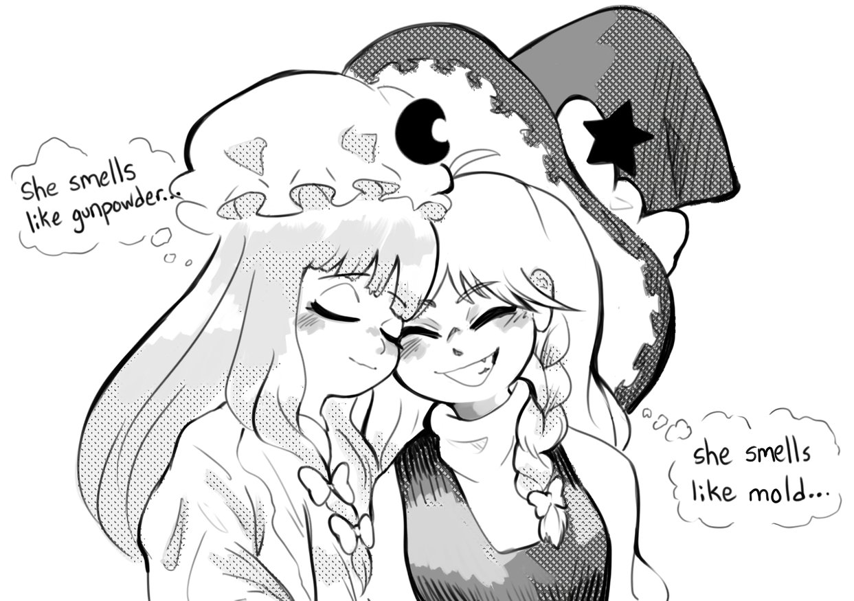 2girls blush bow braid clem_(calmeremerald) closed_eyes commentary english_text greyscale grin hair_bow hat heads_together high_collar kirisame_marisa mob_cap monochrome multiple_girls patchouli_knowledge side_braid smile touhou turtleneck upper_body witch_hat yuri
