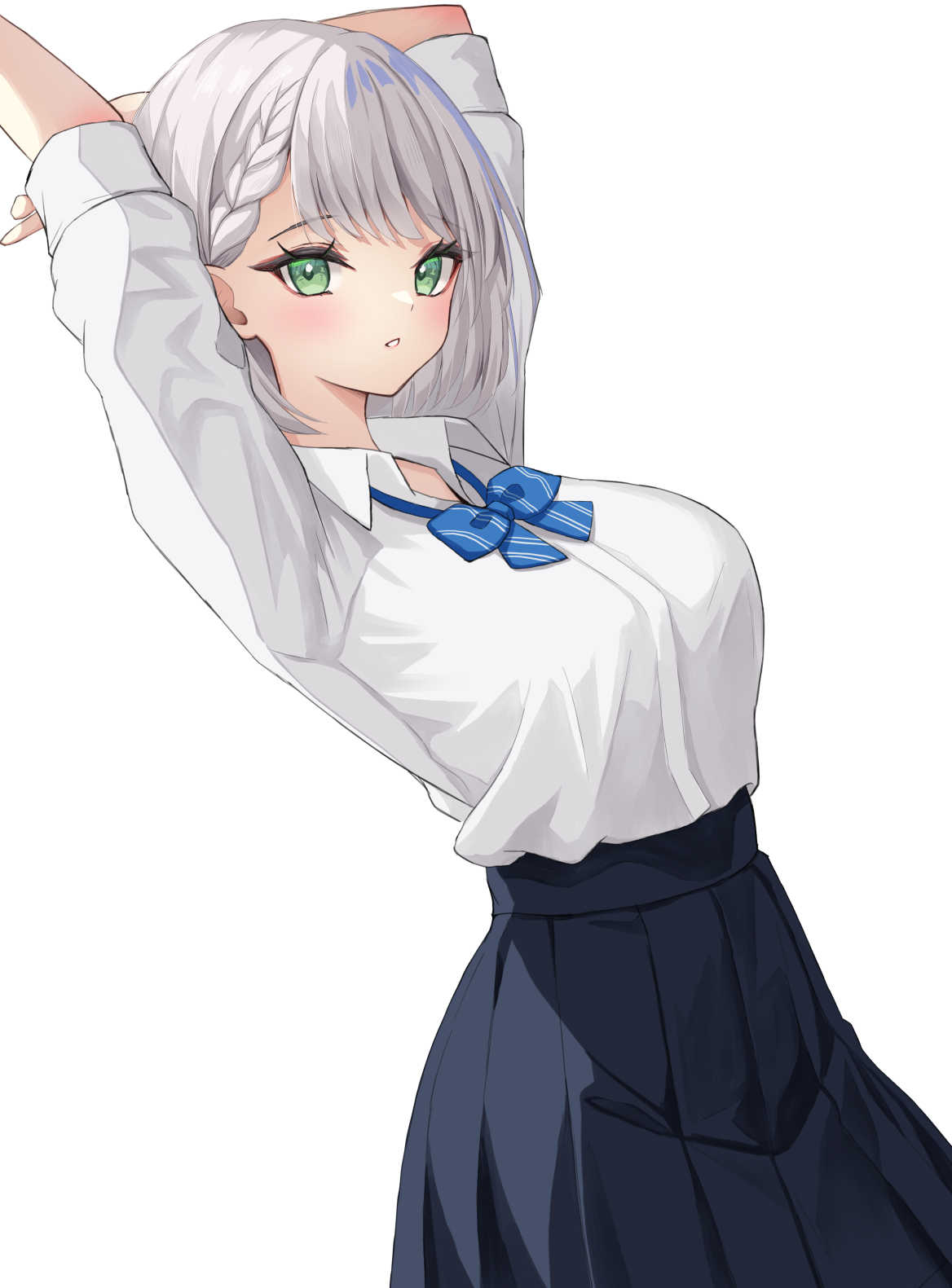 1girl arms_up black_skirt blue_bow blush bow braid breasts collared_shirt dress_shirt dutch_angle green_eyes grey_hair highres hololive large_breasts long_skirt long_sleeves oniku_(o29sukizero) parted_lips pleated_skirt school_uniform shirogane_noel shirt short_hair simple_background skirt solo stretching virtual_youtuber white_background white_shirt
