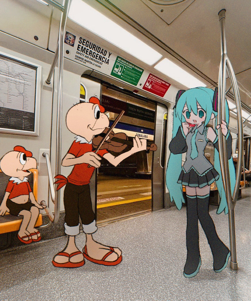 1girl 2boys black_footwear black_skirt blue_eyes blue_hair blue_necktie boots bow_(music) condorito condorito_(character) detached_sleeves flip-flops hatsune_miku holding holding_bow_(music) instrument long_hair multiple_boys necktie pleated_skirt red_footwear ri_(qrcode) sandals skirt thigh_boots twintails violin vocaloid