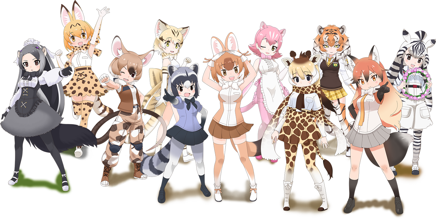 6+girls animal_ears apron belt black_eyes black_hair blonde_hair boots bow bowtie brown_eyes brown_hair chapman's_zebra_(kemono_friends) common_raccoon_(kemono_friends) dhole_(kemono_friends) dress elbow_gloves extra_ears fingerless_gloves gambian_rat_(kemono_friends) garter_straps giant_anteater_(kemono_friends) gloves grey_hair horns jacket japari_symbol kemono_friends kemono_friends_3 long_hair looking_at_viewer multiple_girls necktie official_art one_eye_closed orange_hair pants pantyhose peach_panther_(kemono_friends) pink_hair red_eyes red_fox_(kemono_friends) red_hair reticulated_giraffe_(kemono_friends) ribbon sand_cat_(kemono_friends) scarf serval_(kemono_friends) shirt shoes short_hair siberian_tiger_(kemono_friends) skirt sleeveless sleeveless_shirt socks sweater_vest tail thighhighs transparent_background twintails white_hair yellow_eyes yoshizaki_mine_(style)