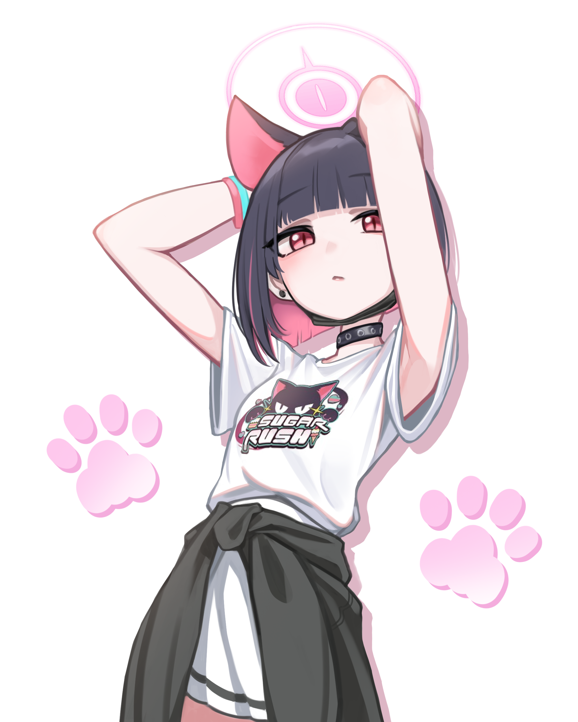 1girl absurdres animal_ears animal_hands armpits arms_behind_head black_choker black_eyeliner black_hair black_jacket black_mask blue_archive blunt_bangs bob_cut breasts cat_ears cat_paws choker closed_mouth clothes_around_waist clothes_writing colored_inner_animal_ears colored_inner_hair cowboy_shot dot_nose extra_ears eyeliner gimgodttule halo highres jacket jacket_around_waist kazusa_(band)_(blue_archive) kazusa_(blue_archive) looking_at_viewer makeup mask mask_pull multicolored_hair pink_hair pink_halo print_shirt red_eyes shirt short_hair skirt small_breasts solo standing t-shirt two-tone_hair white_shirt white_skirt