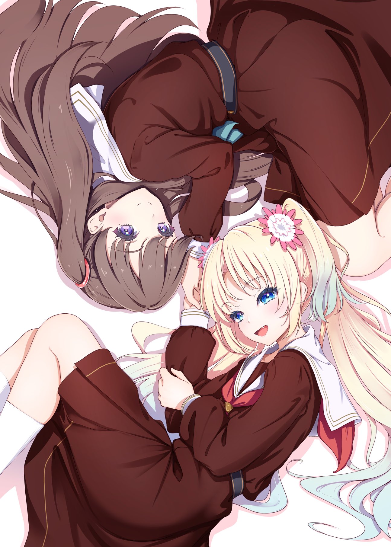 2girls :d amaki-chan_(volfuji) ankle_socks aqua_neckerchief belt black_belt blonde_hair blue_eyes blue_hair brown_dress brown_hair closed_mouth dress fang feet_out_of_frame flower fujishima_megumi gradient_hair hair_flower hair_ornament hasu_no_sora_school_uniform highres holding_hands knees_up light_blue_hair link!_like!_love_live! long_hair long_sleeves looking_at_viewer love_live! lying medium_dress mira-cra_park! multicolored_hair multiple_girls neckerchief on_side open_mouth osawa_rurino parted_bangs pink_flower pleated_dress purple_eyes red_neckerchief rotational_symmetry sailor_collar sailor_dress school_uniform shadow smile socks split_mouth twintails two_side_up virtual_youtuber white_background white_flower white_sailor_collar white_socks winter_uniform