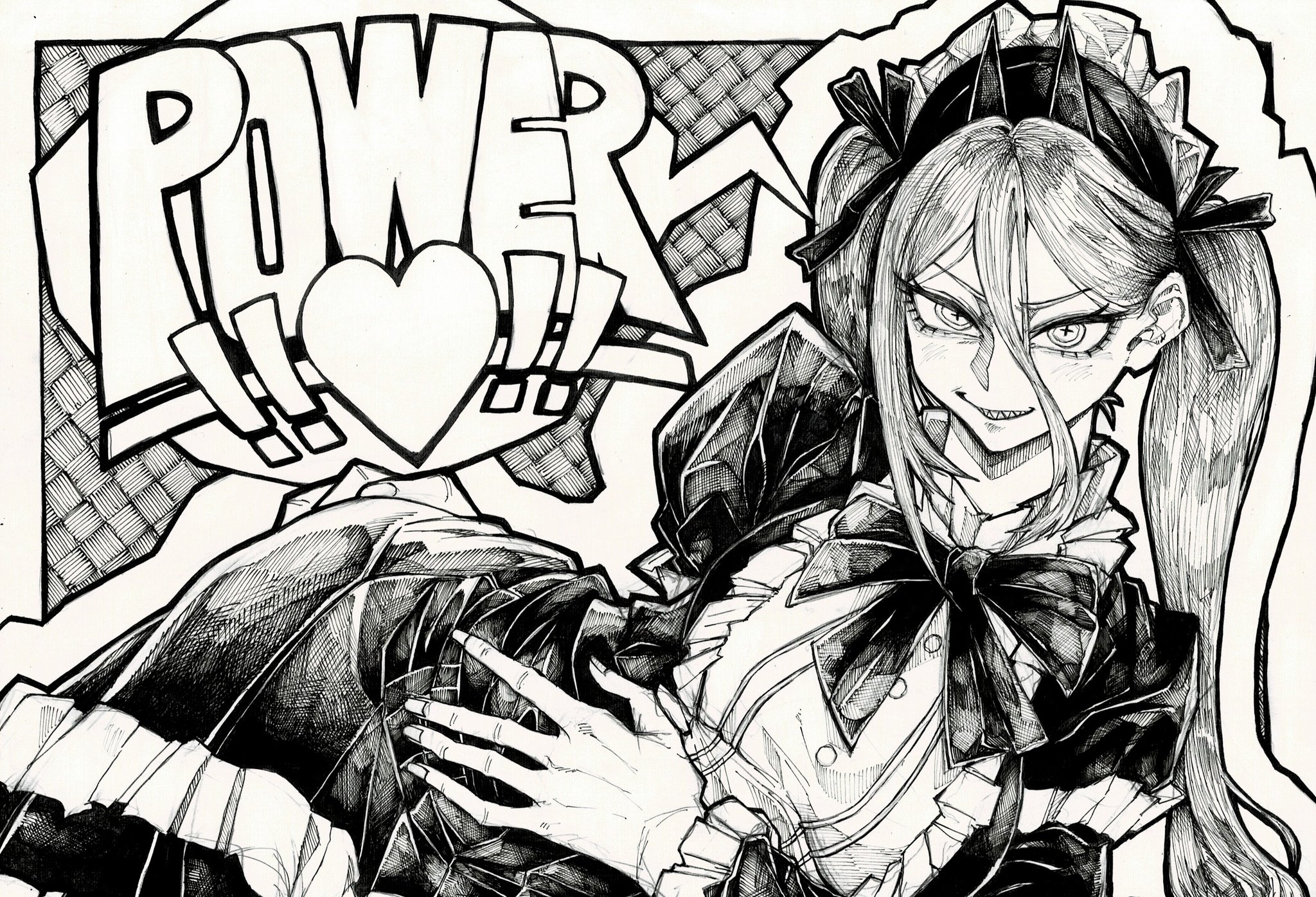 1girl chainsaw_man cross-shaped_pupils demon_horns greyscale hair_between_eyes highres horns kachihoko long_hair looking_at_viewer maid monochrome power_(chainsaw_man) sharp_teeth smile solo symbol-shaped_pupils teeth