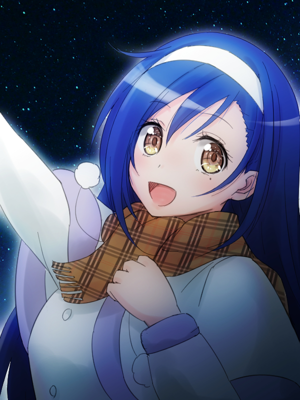 1girl arm_up blue_hair bokutachi_wa_benkyou_ga_dekinai brown_eyes coat furuhashi_fumino hairband long_hair looking_at_viewer mole mole_under_eye night outdoors scarf sky smile solo star_(sky) starry_sky upper_body