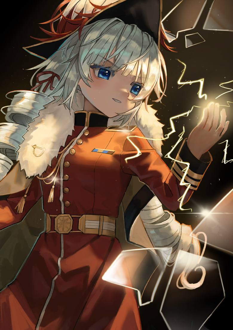 1girl aiguillette black_background black_hat blue_eyes broken_glass brown_cape cape charlie_(reverse:1999) charlie_(through_mirrors_and_curtains)_(reverse:1999) coat_dress dress drill_hair electricity electrokinesis epaulettes glass glass_shards grey_hair grin hair_ribbon hand_up hat hat_feather long_hair long_sleeves looking_at_hand military_uniform official_alternate_costume red_dress reverse:1999 ribbon smile solo twin_drills upper_body v-shaped_eyebrows xhcohiyc