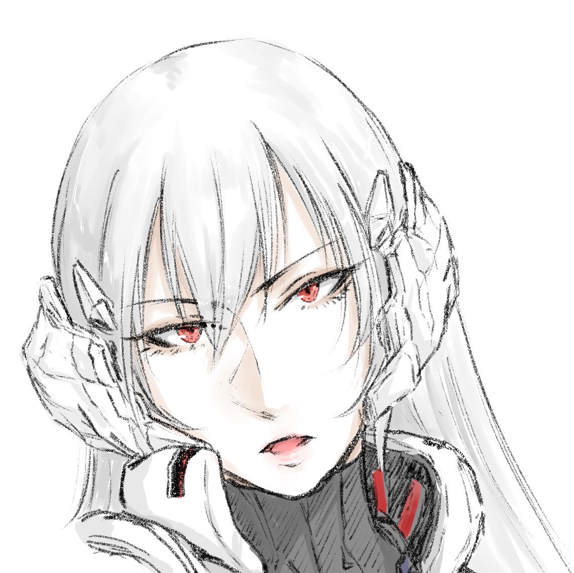 1girl black_shirt close-up grey_hair headgear idolmaster idolmaster_cinderella_girls idolmaster_cinderella_girls_starlight_stage jacket long_hair looking_at_viewer open_mouth portrait red_eyes shirt simple_background solo takamine_noa turtleneck white_background white_jacket you10