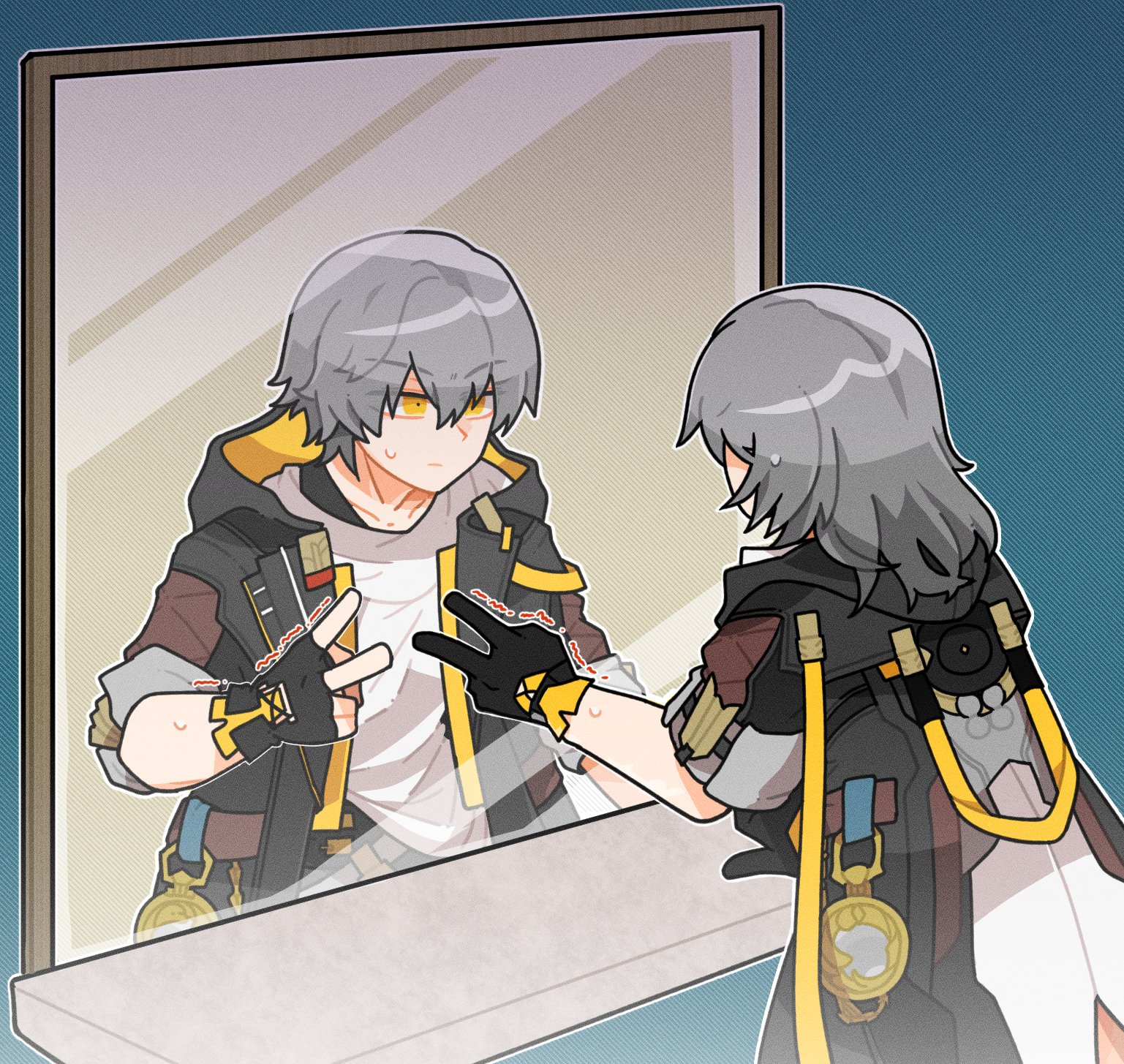 1boy 1girl back black_gloves black_jacket caelus_(honkai:_star_rail) chain closed_mouth collarbone commentary fingerless_gloves gloves gold_chain grey_hair hair_between_eyes help42a highres honkai:_star_rail honkai_(series) hood hooded_jacket jacket long_sleeves looking_at_another looking_at_mirror medium_hair mirror open_clothes open_jacket pocket_watch shirt short_hair standing stelle_(honkai:_star_rail) sweatdrop untranslatable_commentary t-shirt trailblazer_(honkai:_star_rail) two-sided_fabric two-sided_jacket v v-shaped_eyebrows watch white_shirt yellow_jacket